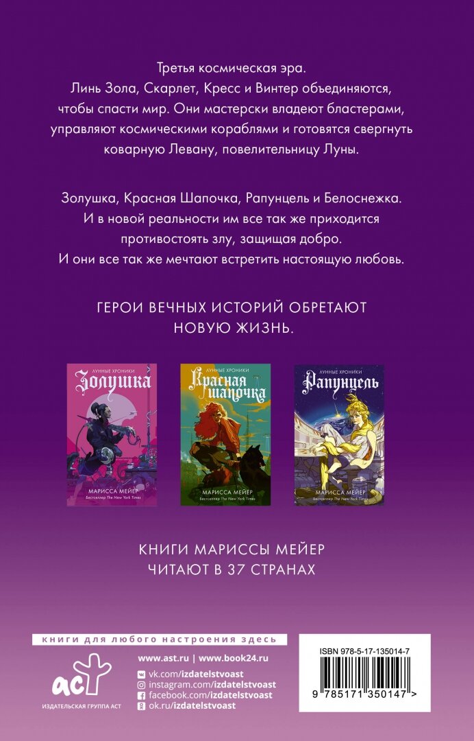 Если хотите перечитать любимую сказку на новый лад, то серия книг "Лунные хроники" для вас. Но для меня - "нелюбителя" фантастики книги дались трудновато, но сюжет завлекает. Правда, в книге небольшой косяк - в аннотации Белоснежку зовут Винтер, а в самой книге Зима. Не принципиально, но всё, так же в самой книге пару опечаток. Но в целом, довольна)