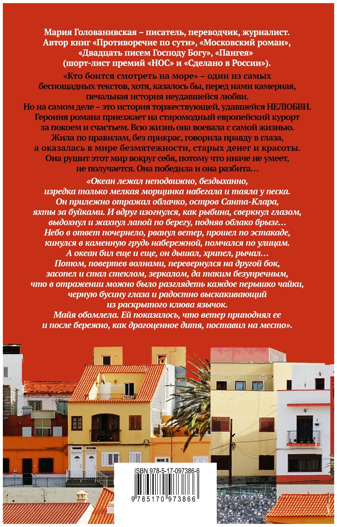 "Кто боится смотреть на море" - один из самых беспощадных текстов, хотя, казалось бы, перед нами камерная, печальная история неудавшейся любви. Но на самом деле - это история торжествующей, удавшейся НЕЛЮБВИ. Героиня романа приезжает на старомодный европейский курорт за покоем и счастьем. Всю жизнь она воевала с самой жизнью. Жила по правилам, без прикрас, говорила правду в глаза, а оказалась в мире безмятежности, старых денег и красоты. Она рушит этот мир вокруг себя, потому что иначе не умеет, не получается. Она победила и она разбита…