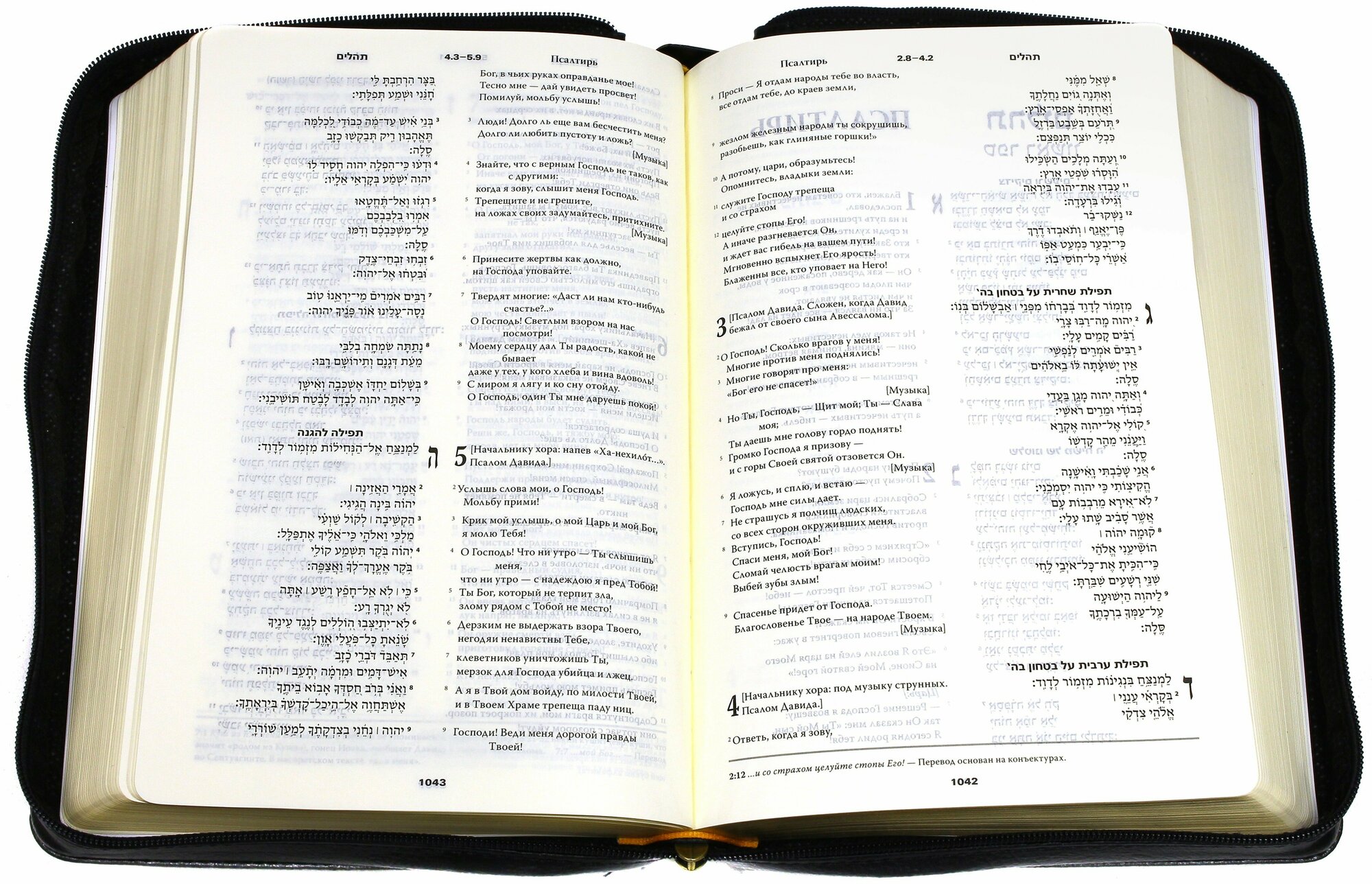 Библия издана на еврейском языке с параллельным переводом на современный русский язык. В книгу вошли "Тора", "Пророки" и "Писания".