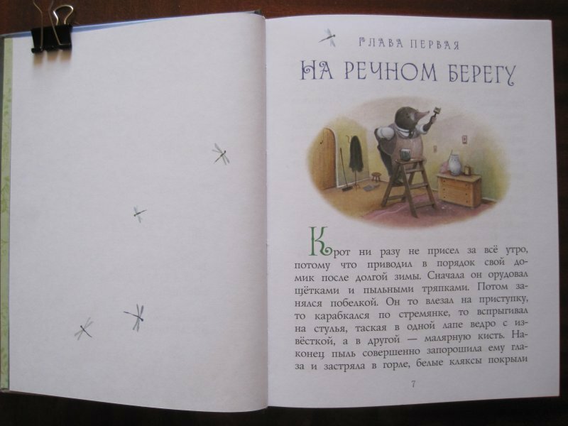 "Всё утро крот Мол усердно трудился, приводя в порядок после долгой зимы свой домишко. Сначала он орудовал метлами и тряпками, затем взял кисть и ведро с побелкой и, залезая то на стремянку, то на стул, принялся за потолок. Но, когда он наглотался пыли и забрызгал побелкой чёрный мех на занывшей спинке и уставших лапах, с работой было покончено.
