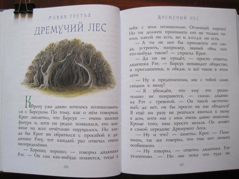 Иллюстраций не много и не мало. На 390 страниц, не считая первых разворотов с названием и содержанием книги, 26 иллюстраций – 22 полностраничные и 4 на разворот – по две в каждой главе (в двух главах – по 3 иллюстрации). Учитывая возрастную аудиторию читателей, я считаю, что этого достаточно. Кроме того, в начале каждой главы идет небольшой рисунок в овале. Печать рисунков четкая, чистые цвета. Страницы с иллюстрациями слегка тонированы в светло-мятный цвет. Книга отпечатана в Можайском полиграфическом комбинате. Ставлю 9 баллов, поскольку мне, как любителю книжной иллюстрации, в идеале хотелось бы иметь "Ветер в ивах" с иллюстрациями Инги Мур. Цену считаю оправданной при условии дополнительной скидки от 20%.