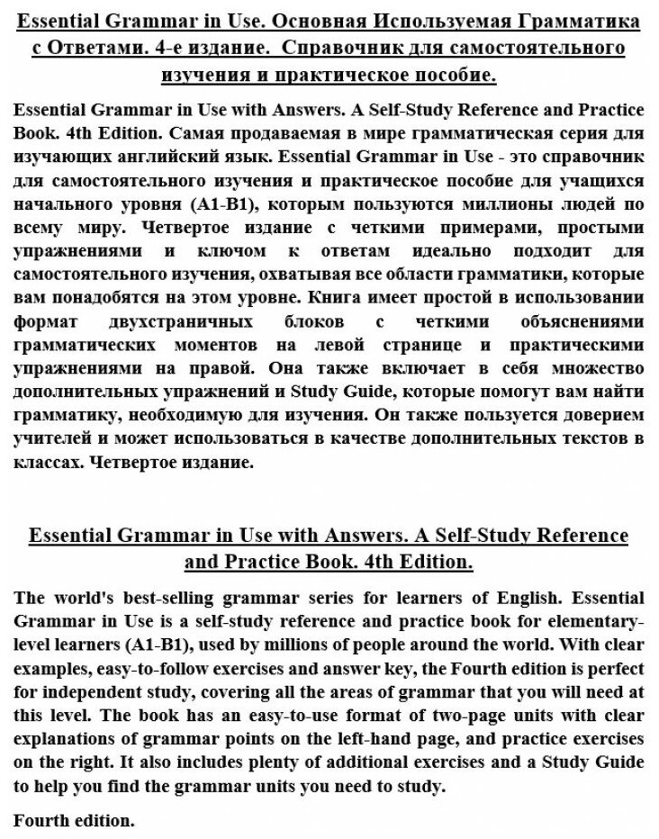The world's best-selling grammar series for learners of English. Essential Grammar in Use is a self-study reference and practice book for elementary-level learners (A1-B1), used by millions of people around the world. With clear examples, easy-to-follow exercises and answer key, the Fourth edition is perfect for independent study, covering all the areas of grammar that you will need at this level. The book has an easy-to-use format of two-page units with clear explanations of grammar points on the left-hand page, and practice exercises on the right. It also includes plenty of additional exercises and a Study Guide to help you find the grammar units you need to study.