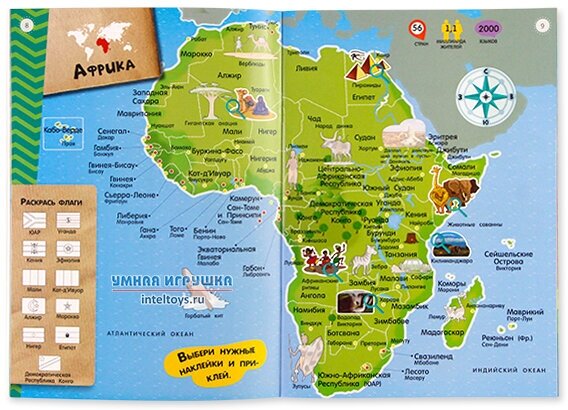 Яркий и большой атлас для маленьких путешественников. Отдельные развороты посвящены общей карте мира, Америке (Северной и Южной вместе), Африке, Европе, Азии, Австралии и Океании, а Арктике и Антарктиде только 1 страница. 2 разворота с довольно крупными наклейками (кроме страницы с флагами) и плакат формата чуть меньше А2 с картой в середине.