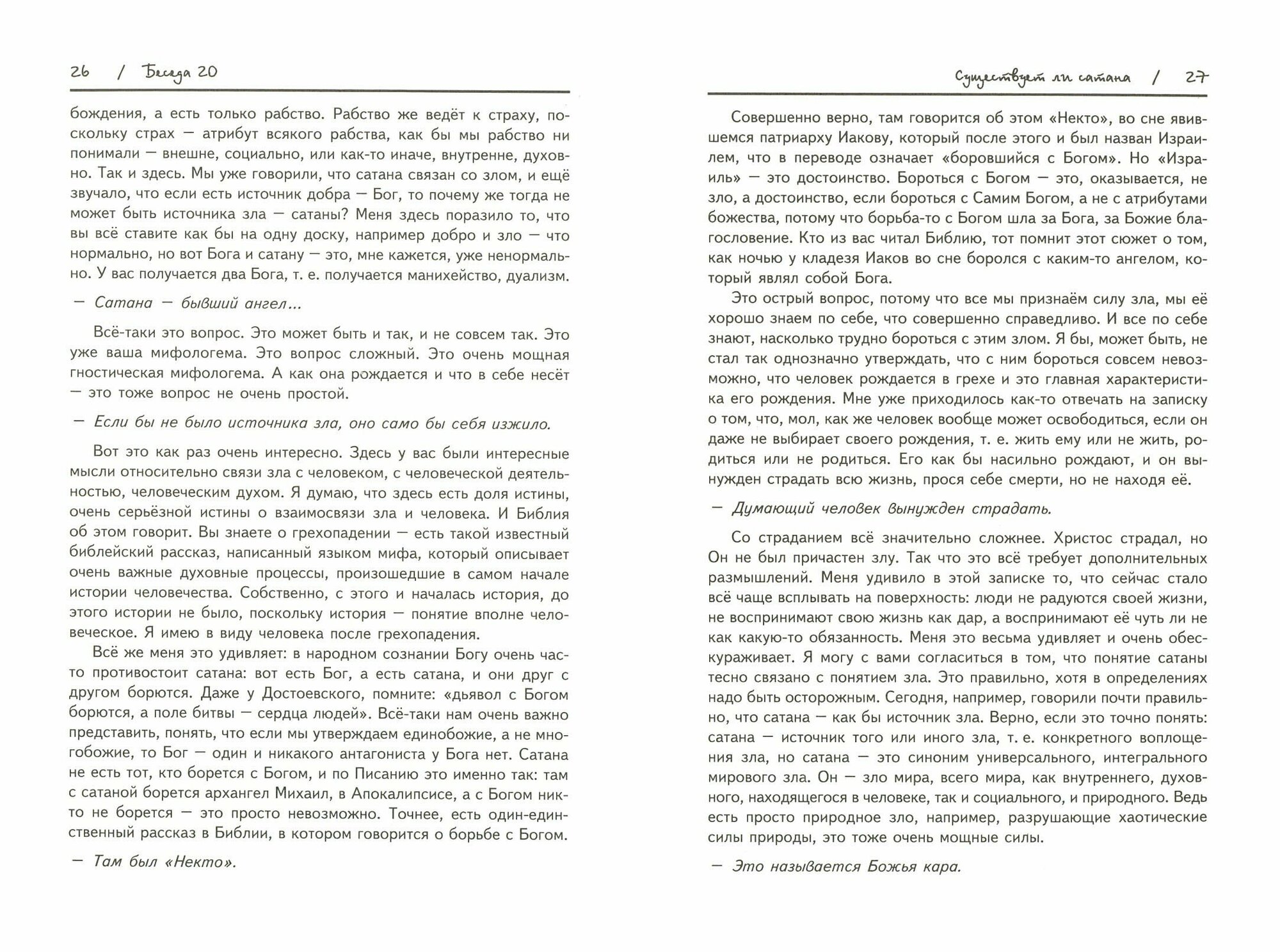 Беседы, которые автор проводил еще в 1990-1992 гг. в качестве добавления к огласительным беседам, представляют собой благовествовательный жанр, любимый святыми отцами и учителями Церкви в "классические" святоотеческие столетия (III-IX вв.). Он был почти забыт в новое время. Жанр беседы отличается от проповедей или писем духовным чадам тем, что это прежде всего устный жанр: речь беседы течет в стилистике живого диалога со слушателями. В беседах воспроизведены вопросы слушателей и ответы, так что и читатель может представить себе эту аудиторию, узнать о проблемах, волновавших ее в тот момент. В настоящий сборник вошли беседы "Экология души и духа" и "Существует ли сатана".