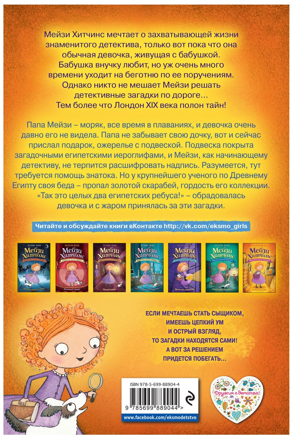 Папа Мейзи - моряк, все время в плаваниях, и девочка очень давно его не видела. Папа не забывает свою дочку, вот и сейчас прислал подарок, ожерелье с подвеской. Подвеска покрыта загадочными египетскими иероглифами, и Мейзи, как начинающему детективу, не терпится расшифровать надпись. Разумеется, тут требуется помощь знатока. Но у крупнейшего ученого по Древнему Египту своя беда - пропал золотой скарабей, гордость его коллекции. "Так это целых два египетских ребуса!" - обрадовалась девочка и с жаром принялась за эти загадки.