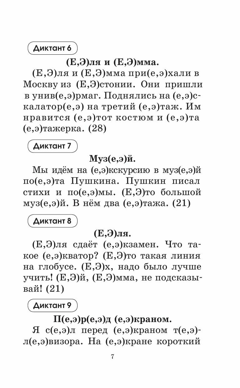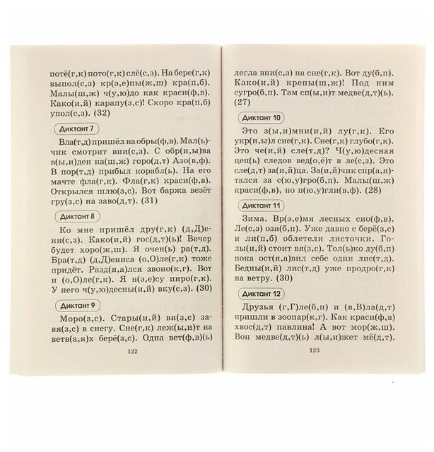 Покупала книгу для второклашки. Здесь собраны диктанты, которые сначала ребенок должен отработать, а потом уже написать под диктовку. Очень интересный вариант отработки правил: ребенок сначала проговаривает каждую орфограмму, объясняет, чтО надо написать и почему, вставляет букву, заодно запоминая зрительно это, а потом уже записывает. Если ребенок сильный или уже хорошо отработал правило, то можно сразу диктовать. На каждую тему диктантов достаточно: от 5-7 до 12-20.