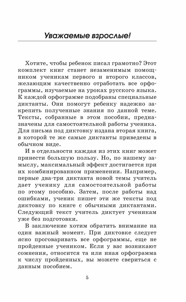 Комплект книг ("Подготовка к контрольным диктантам по русскому языку", "Контрольные диктанты по русскому языку") станет незаменимым помощником ученикам первого и второго классов, желающим качественно отработать все орфограммы, изучаемые на уроках русского языка. К каждой орфограмме подобраны специальные диктанты, помогающие ребёнку надёжно закрепить знания по данной теме.