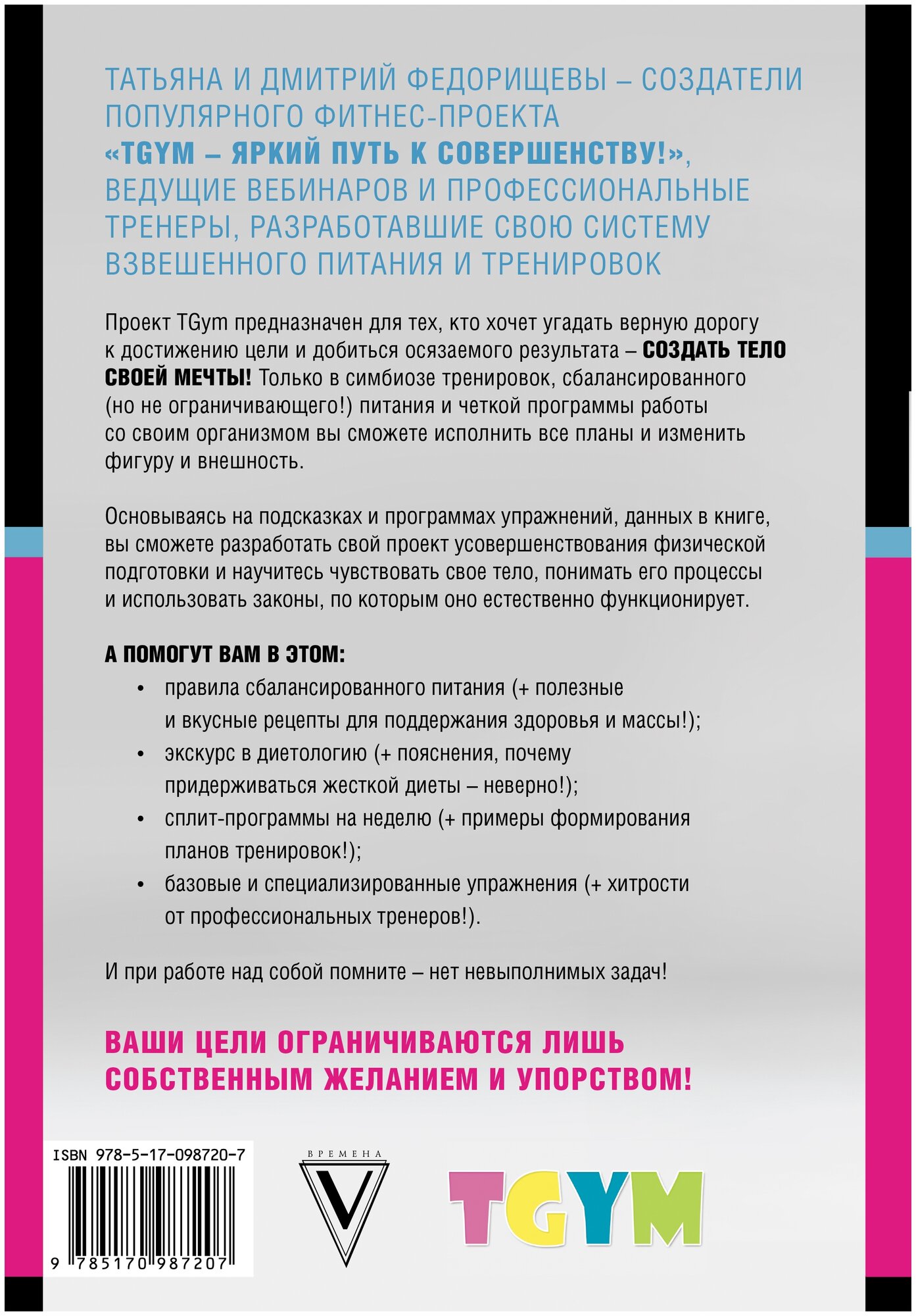 Татьяна и Дмитрий Федорищевы - создатели популярного фитнес-проекта "TGym - яркий путь к совершенству!", ведущие вебинаров и профессиональные тренеры, разработавшие свою систему взвешенного питания и тренировок Проект TGym предназначен для тех, кто хочет угадать верную дорогу к достижению цели и добиться осязаемого результата - создать тело своей мечты! Только в симбиозе тренировок, сбалансированного (но не ограничивающего!) питания и четкой программы работы со своим организмом вы сможете исполнить все планы и изменить фигуру и внешность. Основываясь на подсказках и программах упражнений, данных в книге, вы сможете разработать свой проект усовершенствования физической подготовки и научитесь чувствовать свое тело, понимать его процессы и использовать законы, по которым оно естественно функционирует.
