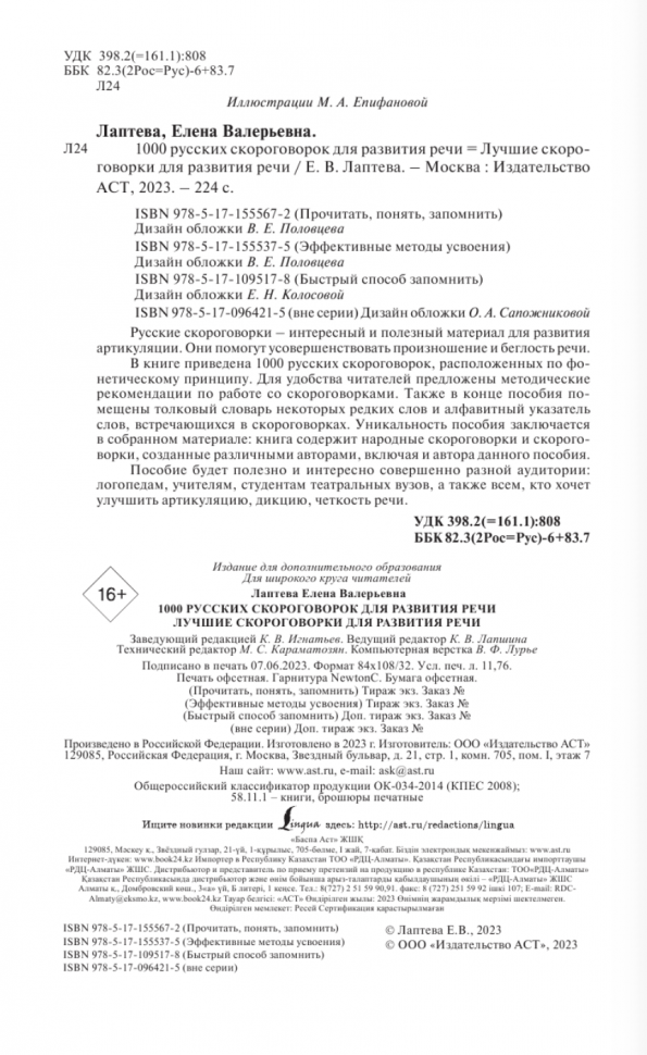 Сервис сравнения цен СкидкаГИД предлагает сравнить цены на товар «Книга: Лучшие скороговорки для развития речи (Елена Лаптева); Издательство АСТ, 2023»