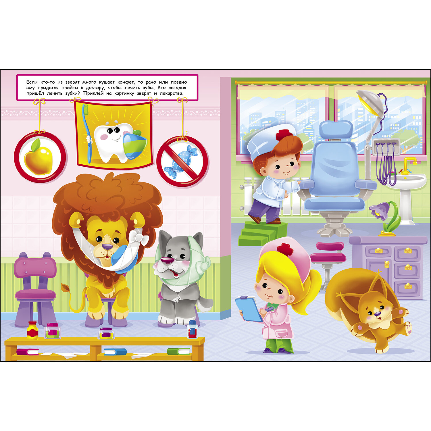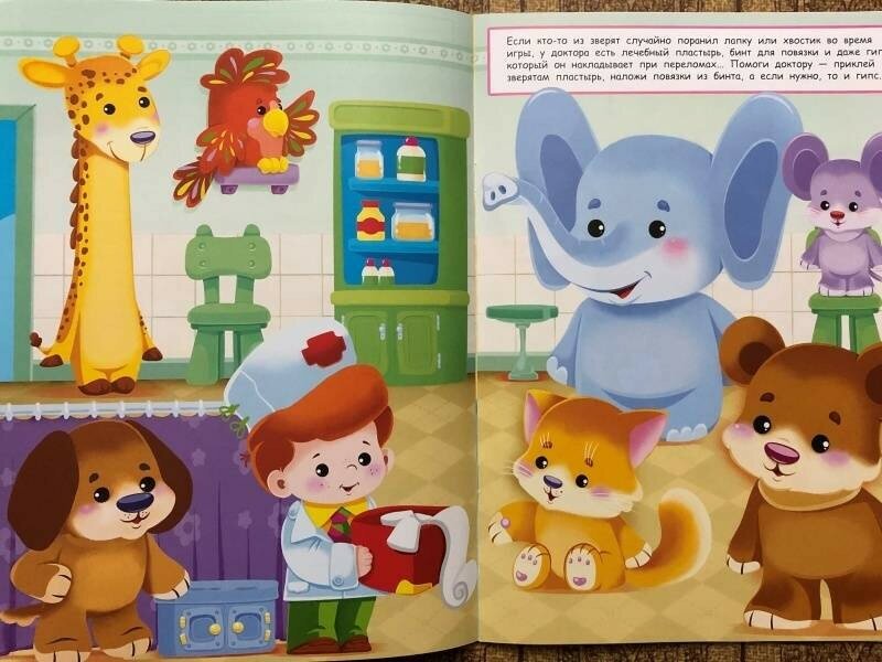 Наш необычный доктор приглашает вашего малыша в свою звериную клинику. Лечите зверюшек - проверяйте зрение, накладывайте повязки, ставьте горчичники. А может кто-то не побоится вырвать больной зуб? Открывайте скорее книжку и приклеивайте картинки на странички!