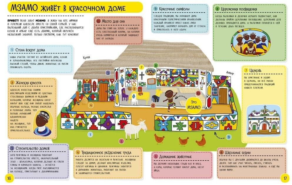 В целом книжка понравилась. Несколько детей по всему миру рассказывают где и как они живут - буквально несколько интересных деталей и картинки. Ребенок заинтересовался, задает вопросы, можно обыгрывать темы, рисовать, мастерить что-то руками, придумывать ситуации. Первый минус, который сразу бросился в глаза: кто-то здоровается на своем языке, а кто-то на русском, немецкий ребенок на обложке говорит Guten Tag, а дальше по тексту уже Здравствуйте! Сосуд с надписью Айран - это не молоко лошадей и т.п. Но материал интересный, понравился. По самим домам еще рекомендую книжку Дома мира, там более развернуто описано именно жилье.