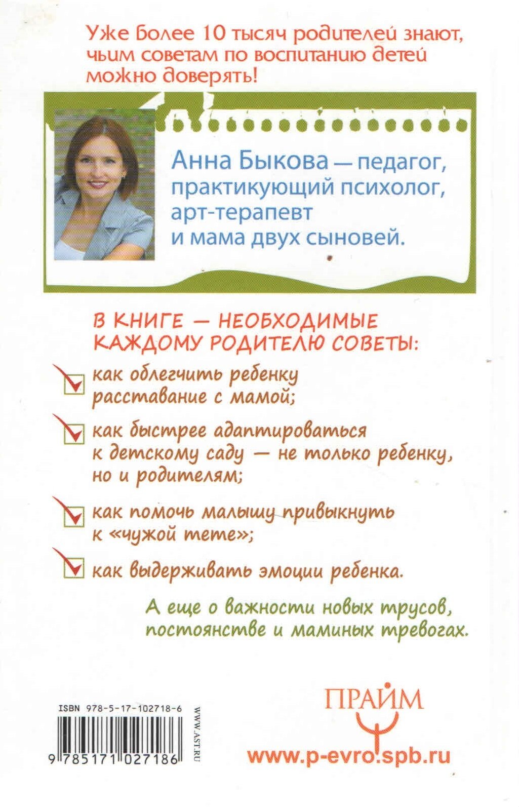 Замечательная книга! Легкая, увлекательная, читается на одном дыхании. Рекомендуется всем, чьи детки только пошли в садик или собираются идти, всем родителям,кто находится в сомнениях или тревогах относительно садика или тем, у кого сложности с садиком у детей. Жалею, что не прочла эту книгу раньше, когда моя старшая дочка только пошла в садик-это помогло бы мне избежать многих проблем и облегчить ребенку адаптацию. Надеюсь, что с младшей дочкой у меня таких проблем не возникнет благодаря Анне Быковой))) В свой книге она, основываясь на своем личном опыте воспитателя, приводя примеры из жизни, советует, как облегчить ребенку жизнь в садике, как понять, нравится ребенку садик или нет. Для меня как для психолога также были интересны рекомендации по диагностике ребенка и коррекции его поведения. И что очень важно, все это описано простым, понятным каждому языком. Я советую всем мамам прочитать эту полезную и мудрую книгу.
