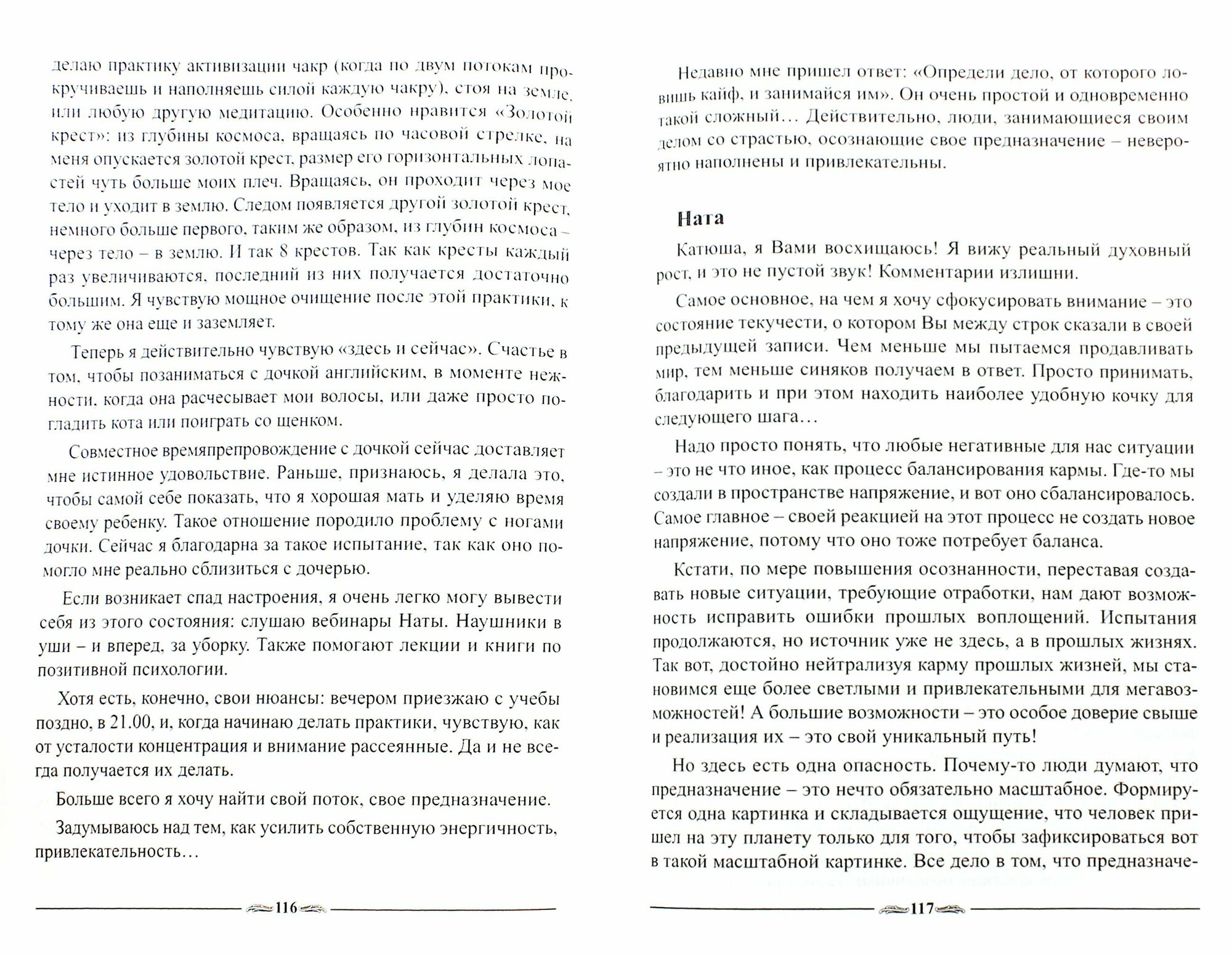 Эта книга - реальная жизнь в процессе, в настоящее время, такая, какая она есть. Книга написана в виде диалога между двумя соавторами, Катей и Натой. Катя - девушка, которая решила преобразовать свою жизнь в соответствии с высшей идеей и привести ее к полной гармонии. Ната - человек, который прошел многие этапы этого пути, набил шишек, наделал выводов и позволяет себе комментировать и корректировать движения Кати. В этой книге вы найдёте ответы на насущные вопросы, полутона, нюансы, которые можно уловить только в живом общении.