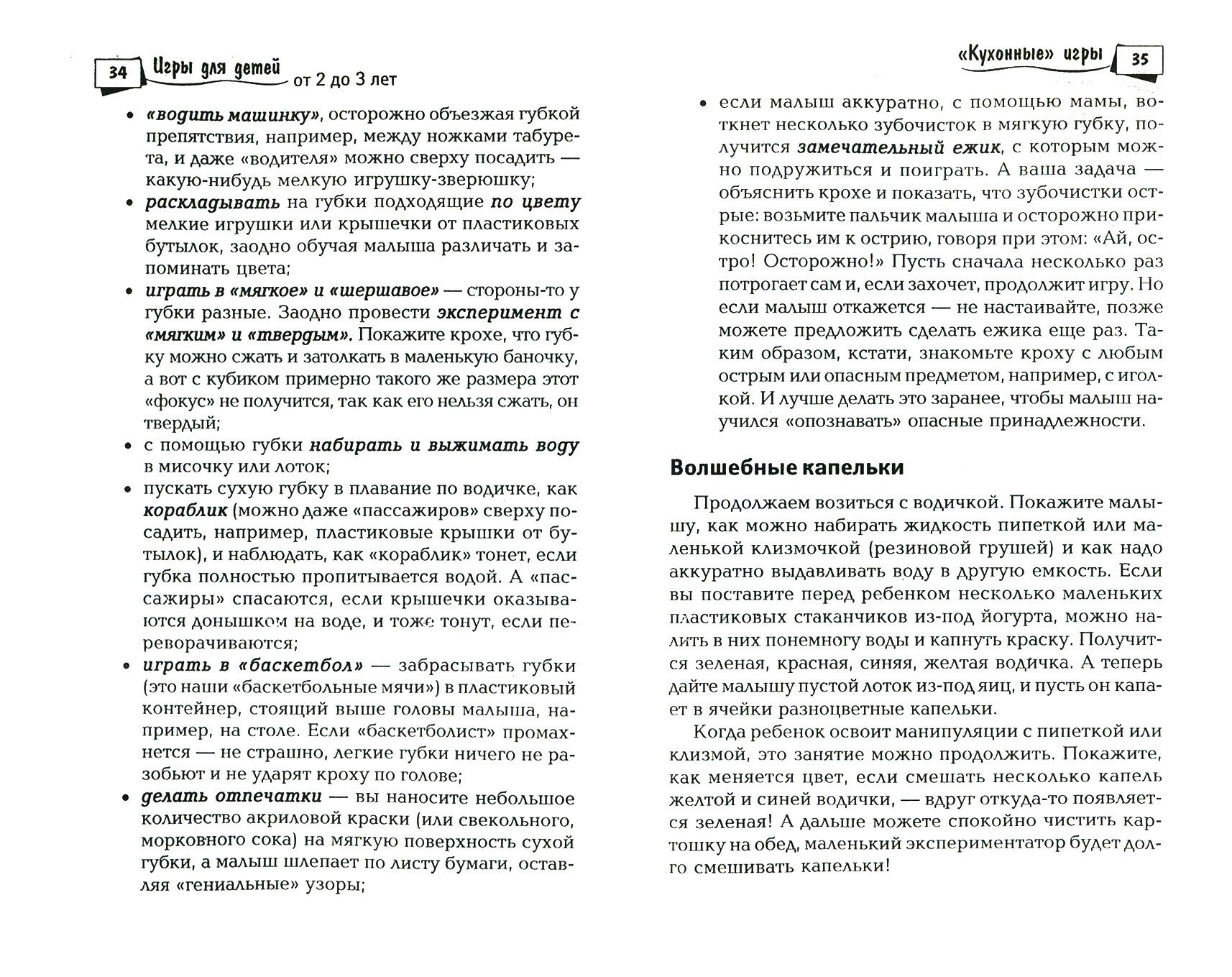 Неплохая книга не только в помощь родителям, но и специалистам, находящимся в поиске разнообразных идей игр для развивающих занятий с детьми 2-3 лет. Книга небольшая по объему, но количество игр в ней достаточное. Это не программа занятий, а сборник отдельных игр. В содержании книги выделяются игры для проведения в комнате, в ванне, на кухне. Это интересно и правильно, так как позволяет сделать обучающими и радостными естественные ситуации в жизни ребенка (когда не нужно искусственным путем «развивать» ребенка). Также есть группа собственно развивающих игр (на развитие психических процессов, с учетом возраста) «Играем-развиваем». Раздел «Физкультминутки» содержат тексты стихов, с указанием движений, которые при их чтении необходимо выполнять. Не лишними являются и игры на развитие мелкой моторики. И уж совсем интересный раздел «Играем с чем угодно». В нем даны несложные идеи, как из бросового материала сделать интересные игрушки-забавы для детей.