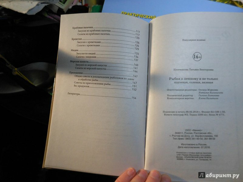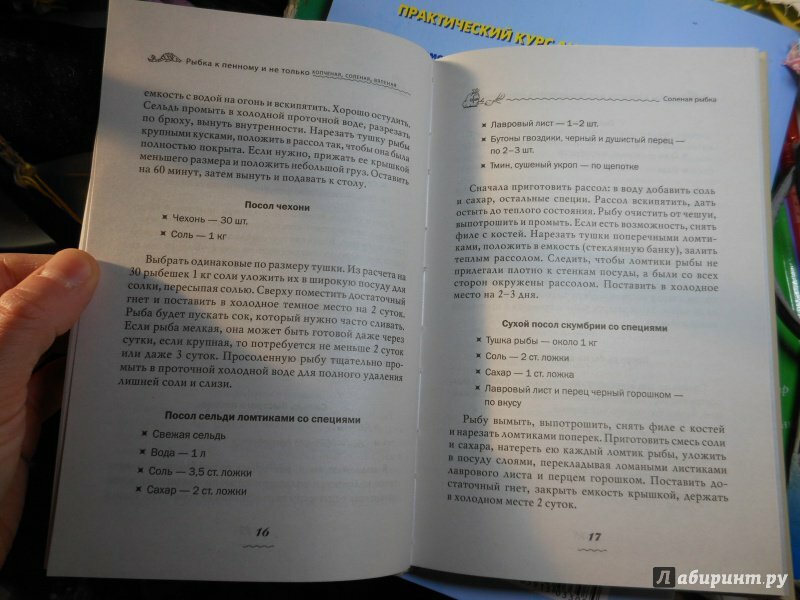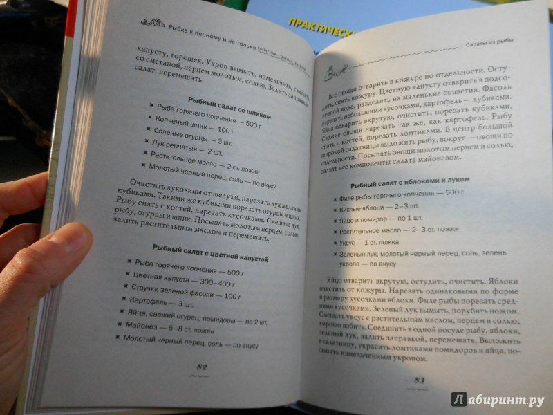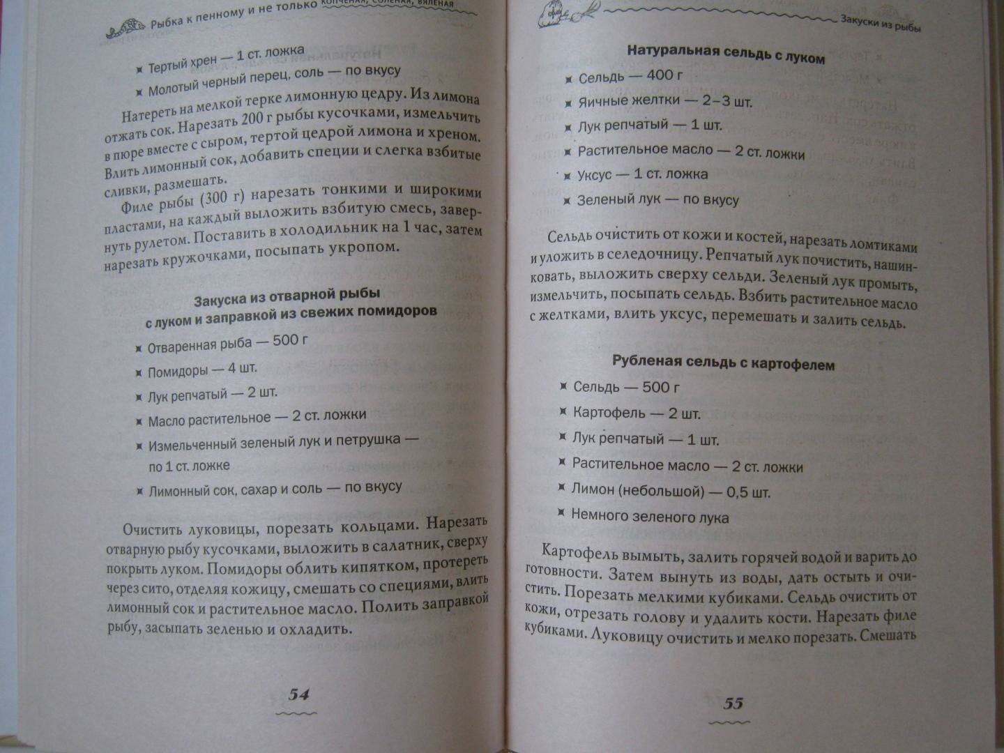 Ожидала немного другого. Но эта книга тоже неплохая. Много полезной информации. Рассказано, как рыбу засолить несколькими способами, как вялить, коптить, сушить разную рыбу. Большую часть книги составляют рецепты, что с этой рыбой делать дальше. Есть рецепты и для морепродуктов. Есть рецепты "ложной" икры и даже шашлыка из рыбы. Рецепты доступные.