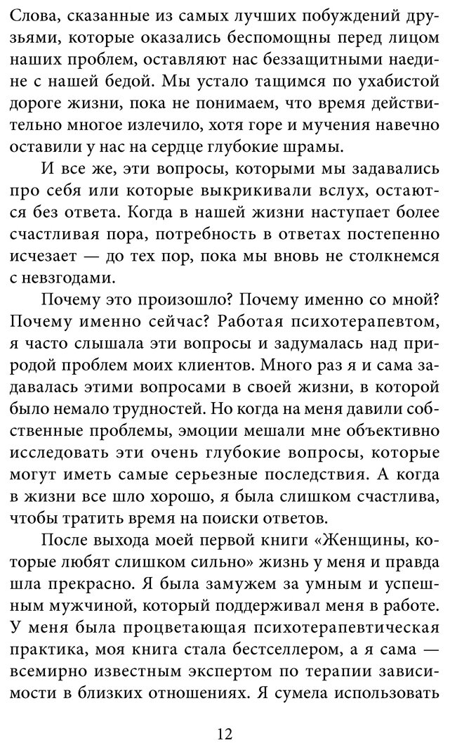 Книга-бестселлер Робин Норвуд «Женщины, которые любят слишком сильно» перевернула наши представления о любви и помогла нескольким поколениям женщин во всем мире избавиться от созависимости и выйти из неблагополучных отношений. Став всемирно известным специалистом по терапии зависимостей, Робин Норвуд неожиданно столкнулась с тяжелым личностным кризисом, оставила психотерапевтическую практику и на протяжении десяти лет изучала эзотерические традиции и доктрины, альтернативную медицину и практики целительства. В своей новой книге она предлагает читателям революционный взгляд на смысл невзгод и страданий, через которые проводит нас судьба. В этой книге: