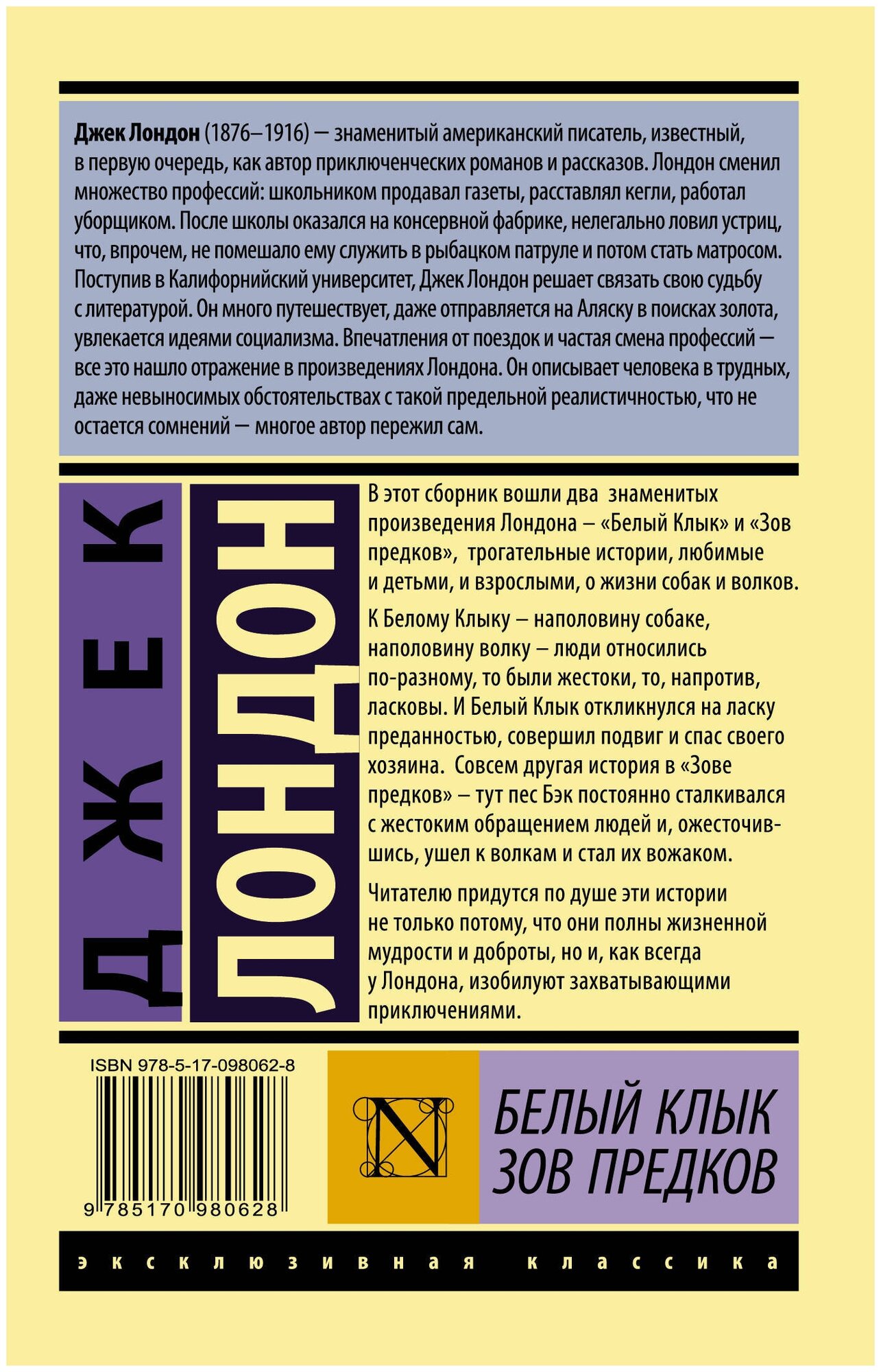 В сборник вошли два знаменитых произведения Лондона - "Белый Клык" и "Зов предков", трогательные истории, любимые и детьми, и взрослыми, о жизни собак и волков.