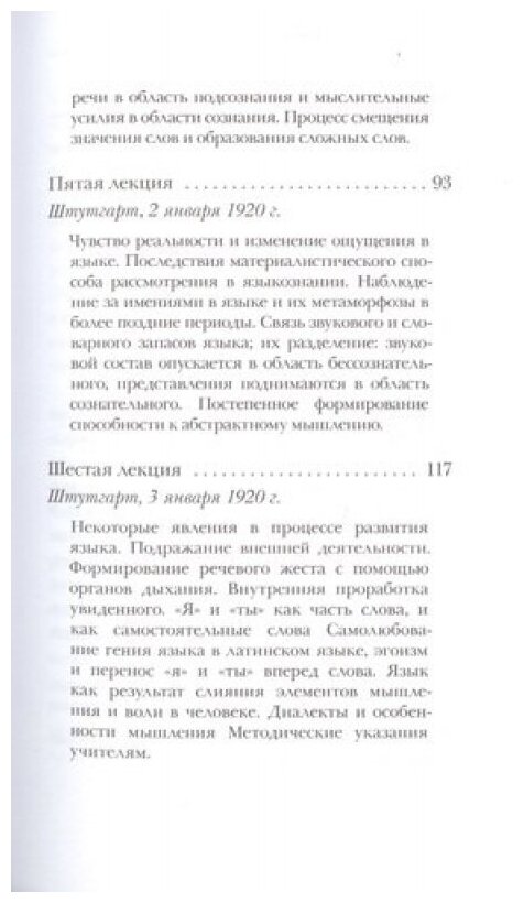 Книга будет интересна не только антропософам и теософам, но и людям, жизнь и работа которых связана с иностранными языками, прежде всего, с немецким, потому что в ней автор анализирует с большим количеством примеров роль языка в становлении духовной жизни народа. Структурно книга представляет собой курс из четырех лекций, прочитанных в Штутгарте в декабре 1919 г. Штайнер касается таких проблем, как исторический обзор процесса становления языка, расширение словарного запаса немецкого языка благодаря потоку заимствований, влившемуся из христианства, как душевное содержание находит в языке свое выражение, изменение со временем значения слов, преобразование языка как внутренне самостоятельное достижение души народа, постепенное формирование способности к абстрактному мышлению, язык как результат слияния элементов мышления и воли в человеке и др. Книгу также можно рекомендовать психологам, философам и педагогам.