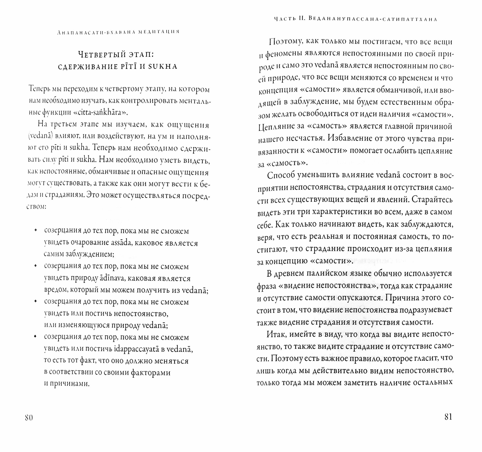 В книге представлены работы двух известных учителей традиции тхеравада. Первая из них - "Анапанасати-бхавана медитация" - запись лекций почтенного Аджана Буддхадасы, посвященных медитативной технике внимательного наблюдения за дыханием (анапанасати). В ней излагаются все шестнадцать ступеней данной медитативной практики, начиная с наблюдения за дыханием и сопутствующими процессами в физическом теле, и завершая отпусканием всех свойственных нам привязанностей, что ведет к прекращению страданий - ниббане.