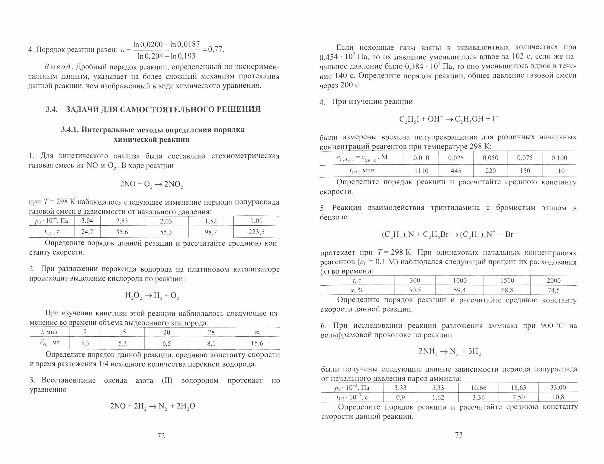 В учебном пособии рассмотрены вопросы формальной кинетики, теоретические представления химической кинетики, кинетики твердофазных реакций, кислотно-основного катализа, ферментативных реакций, а также некоторые вопросы гетерогенно-каталитических процессов. Содержит более 40 примеров задач с решениями и более 400 задач для самостоятельного решения по разделам "Кинетика химических реакций" и "Катализ" в курсе физической химии. Предназначено для студентов химических специальностей вузов.