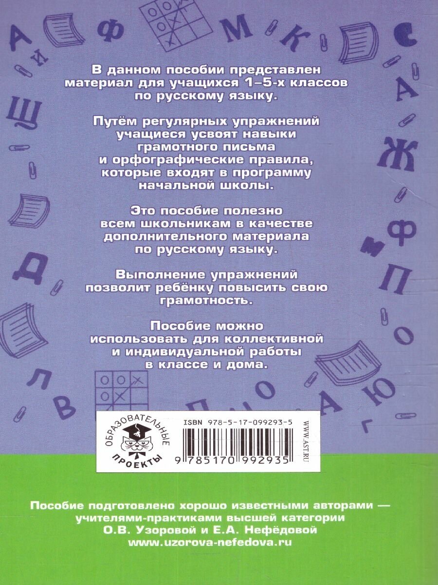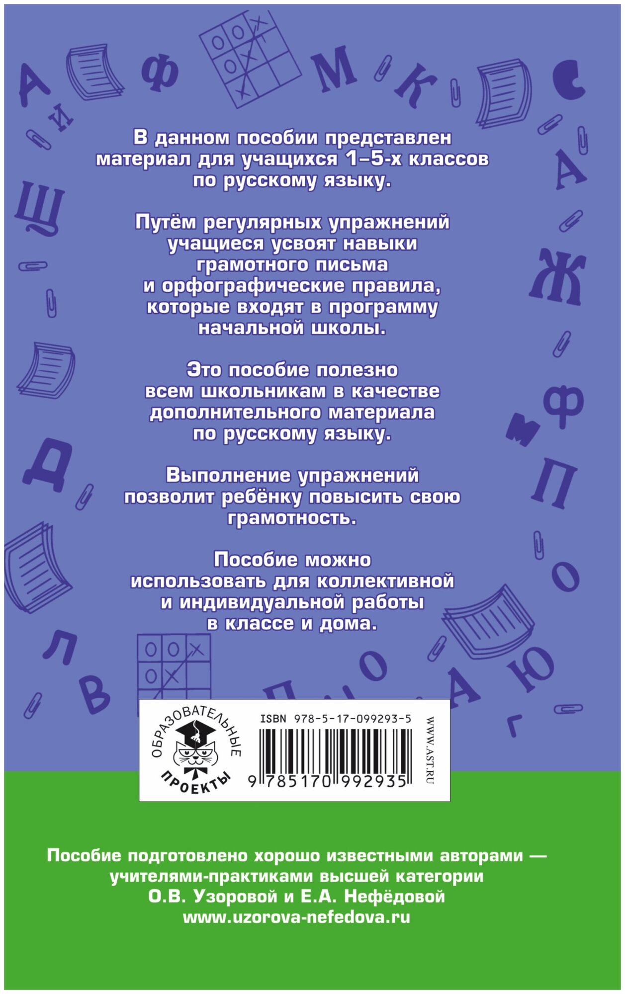 В данном пособии представлен материал для учащихся 1-5 классов по русскому языку. Путем регулярных упражнений учащиеся усвоят навыки грамотного письма и орфографические правила, которые входят в программу начальной школы. Это пособие полезно всем школьникам в качестве дополнительного материала по русскому языку. Выполнение упражнений позволит ребенку повысить свою грамотность. Пособие можно использовать для коллективной и индивидуальной работы в классе и дома.