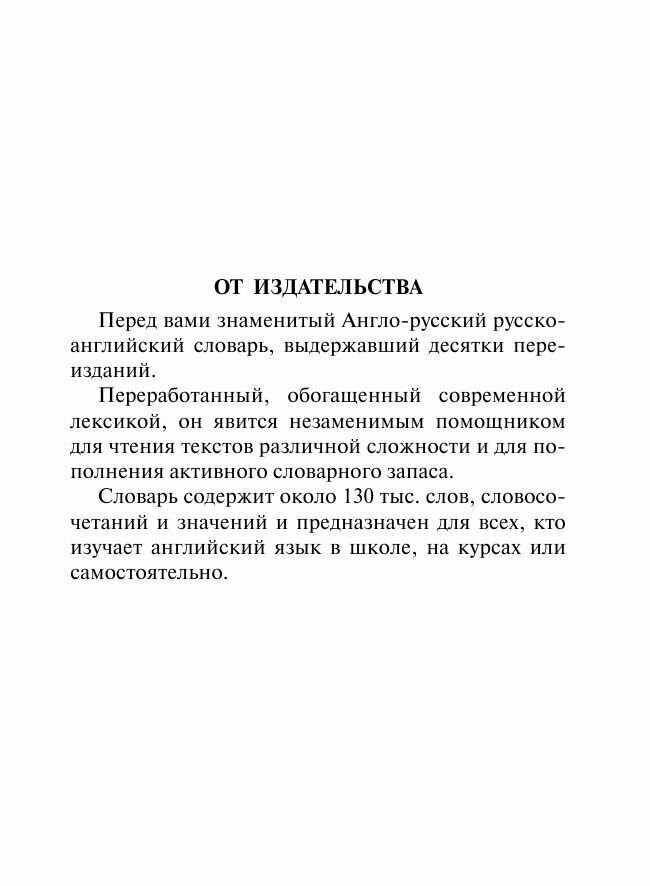 Словарь, выдержавший десятки переизданий, переработанный, обогащенный современной лексикой, является незаменимым помощником для чтения и перевода текстов различной сложности, для пополнения активного словарного запаса пользователя до уровня Upper-Intermediate.