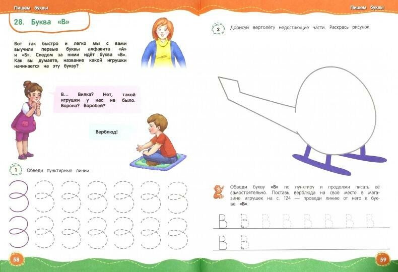 Книжка мне понравилась. Подойдет для начального обучения письму. В ней есть задания на штрихову, обвести по пунктиру узоры, написание букв (2 строчки на каждую букву), простенькие лабиринты. Написания цифр нет. Единственное что бросилось в глаза: 2 страницы повторяются из полного курса подготовки к письму