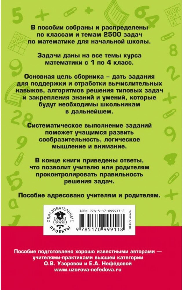 Математика. 1-4 классы. 2500 задач (Узорова Ольга Васильевна, Нефедова Елена Алексеевна); ООО "Издательство Астрель", 2016