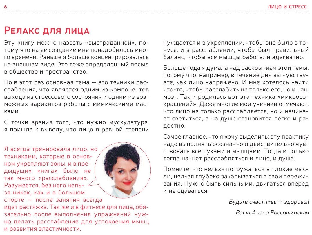 Уникальная система из фитнеса для лица, расслабляющих и восстанавливающих техник от международного тренера по фейсфитнесу Алены Россошинской уже помогла более 100 000 человек. Ее авторская методика и годы практики открывают каждому мир красивого лица, без морщин, мимических масок и груза лет. Новая практическая система – это свежее слово в уходе за лицом. Точечным, самым аккуратным из возможных воздействий, не перегружая мышцы и кожу, вы сможете в буквальном смысле обновить его. Подтянуть кожу, снять самые сложные зажимы, разгладить морщины и ощутить поразительное расслабление в каждой мышцы – всё это возможно благодаря развитию чувствительности лица и деликатным упражнениям, основанным на микродвижениях мышц. Вы почувствуете, как привычки морщить лоб, поджимать губы, негативная мимика и сопутствующие складки с морщинами уходят в прошлое, оставляя вам ваше лицо в его естественной красоте.