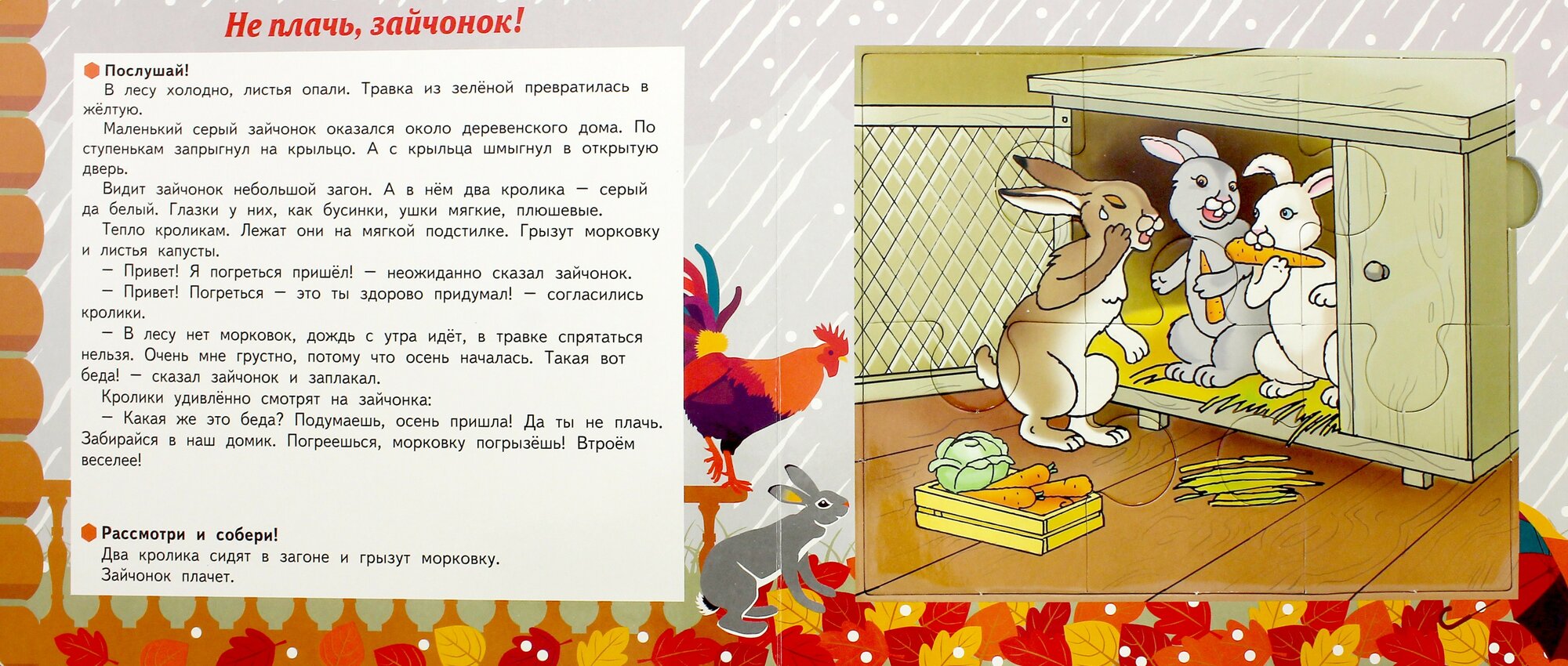 Книга у нас давно, года два. Решила написать рецензию, так как в ней всё идеально. До сих пор она в отличном состоянии. Картон оочень плотный, ламинированный. Самое главное, что пазлы не высыпаются сами по себе, как в других аналогичных книжках. Сделано удобное углубление для пальца, чтобы вынуть пазлы. Картинки красивые. Тексты доброжелательные, интересные. Очень удивляет, как рассчитали размер деталей, что они хорошо держатся в ячейке, не выпадывают. При этом удобно доставать и вставлять. Очень раздражает в других книжках -не успеешь открыть, все содержимое вывалилось. Детали теряются. Я поэтому другие выкинула, чтобы нервы не портить. Оставила только эту серию. Под пазлами на рисована эта же иллюстрация для подсказки. Благодаря этому научились собирать пазлы в картинку. Вобщем, здесь всё идеально! Рекомендую!