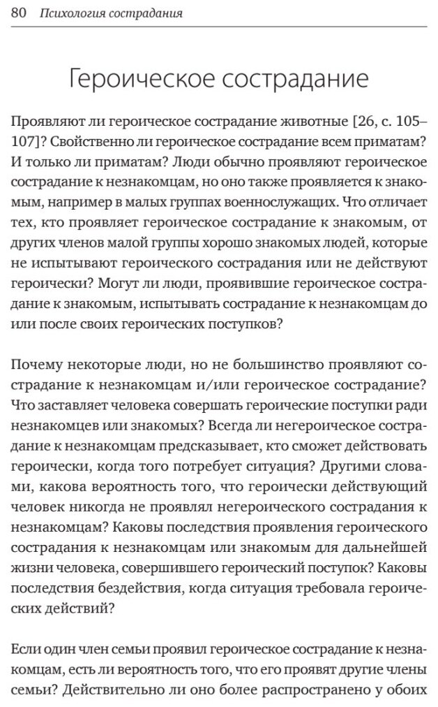 Я бы назвала эту книгу- книга-вопрос. В ней автор не столько освещает вопросы психологии сострадания, сколько ставит многочисленные вопросы, на которые еще предстоит найти ответы, проведя множественные исследования. В книге много гипотез, выстроенных автором и его размышлений, пока не подтвержденных. Конечно, теоретический материал тоже имеется, но в сравнении с другими книгами автора, в этой он очень скудный. Да и шрифт это подтверждает: огромный (обычно в этой серии шрифт очень мелкий). Первое впечатление, когда открыла книгу-нечего было писать, а объем и формат должен быть!