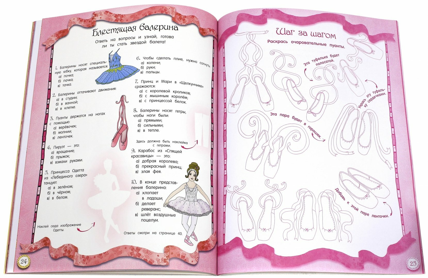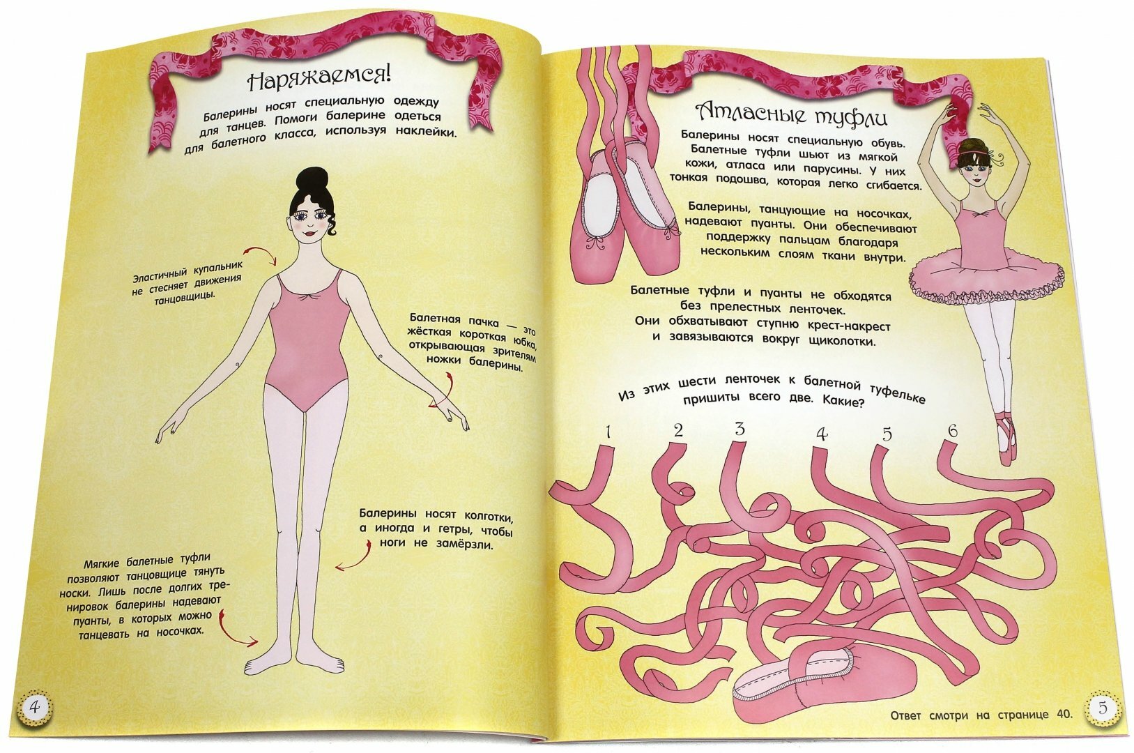 Моя дочка (скоро 8) занимается хореографией, мечтает поскорее встать на пуанты. Увидела эту книжку в магазине и очень ее захотела. Я как обычно зашла на сайт Лабиринта, нашла ее (дешевле, чем в магазине) и заказала. Дочка второй день с ней занимается, клеит, раскрашивает, комментирует балетные позиции. Ей очень нравится. А мне нравится, что в книжке не только наклейки или раскраски, а и немало информации о балете.