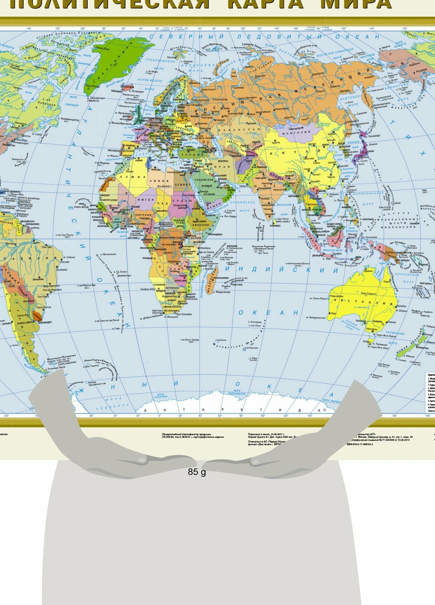 Двухсторонняя настенная карта имеет размеры 870х580 мм. На одной её стороне - Политическая карта мира в масштабе 1:40 000 000 (в 1 см 400 км), на другой - карта "Федеративное устройство России" в масштабе 1:10 000 000 (в 1 см 100 км). На Политической карте мира цветом и подписями показаны все независимые государства с их столицами, а также владения и территории с особым статусом. Населённые пункты на карте даны в трёх градациях численности: более 1 млн жителей, от 100 тыс. до 1 млн, менее 100 тыс. жителей. На карте России представлены все 85 субъектов Федерации, включая Республику Крым и Севастополь, с их столицами и центрами. Субъекты РФ сгруппированы по 9 федеральным округам. Показаны магистральные пути железнодорожного и автомобильного сообщения. Рекомендовано для широкого круга пользователей.