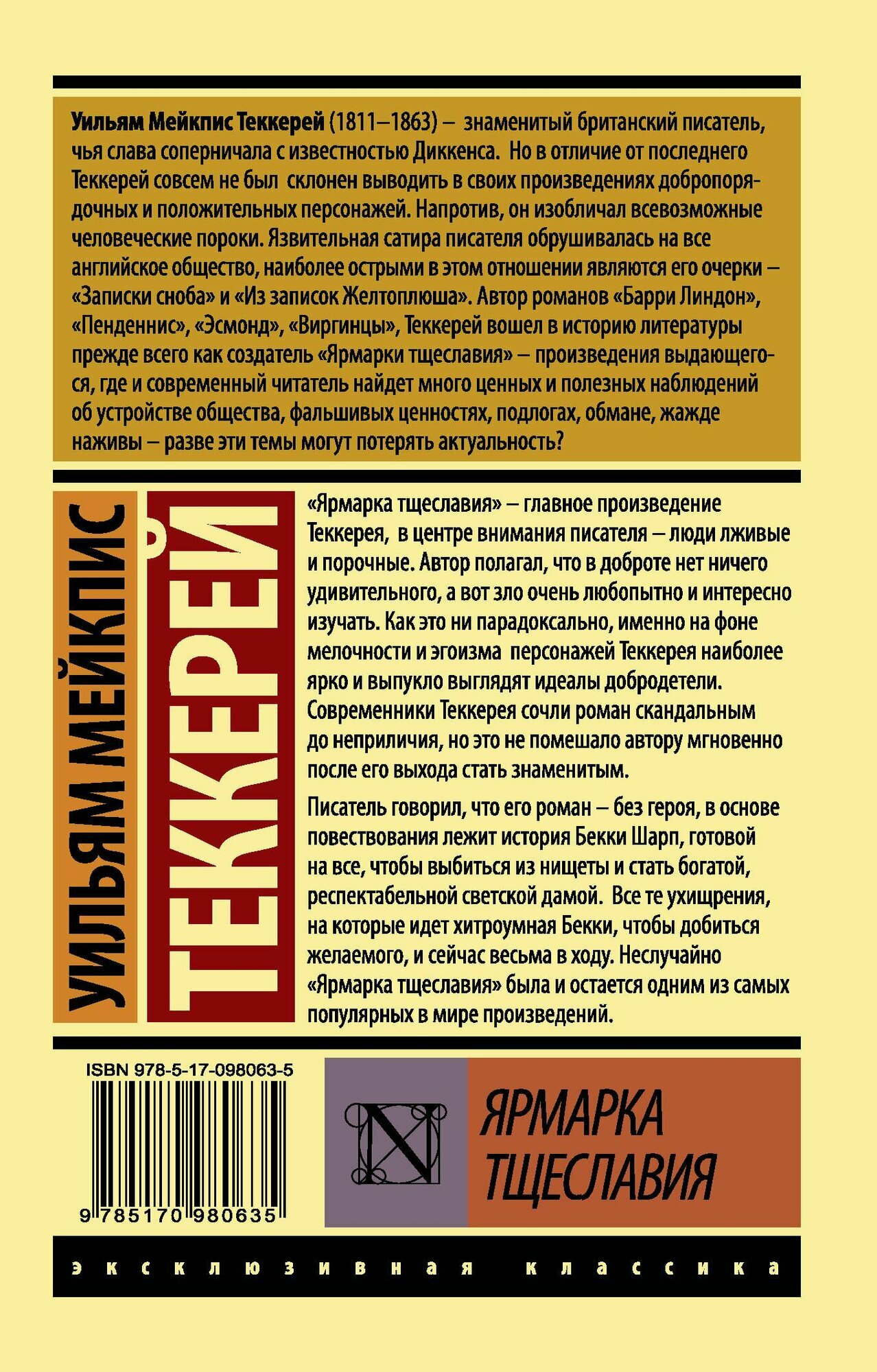 "Ярмарка тщеславия" - главное произведение Теккерея, в центре внимания писателя - люди лживые и порочные. Автор полагал, что в доброте нет ничего удивительного, а вот зло очень любопытно и интересно изучать. Как это ни парадоксально, именно на фоне мелочности и эгоизма персонажей Теккерея наиболее ярко и выпукло выглядят идеалы добродетели. Современники Теккерея сочли роман скандальным до неприличия, но это не помешало автору мгновенно после его выхода стать знаменитым.
