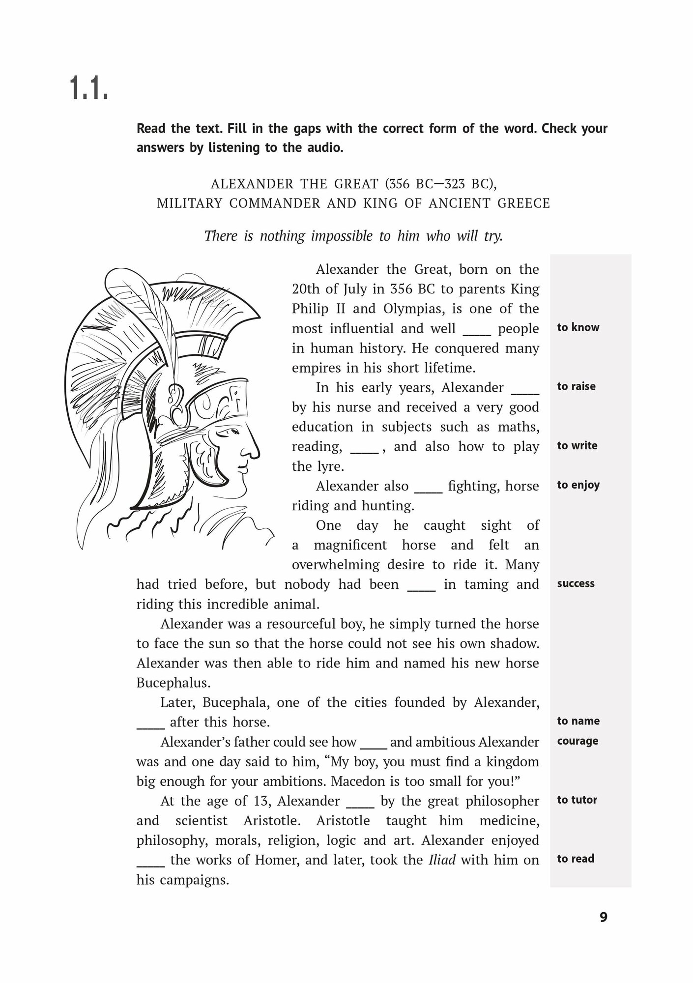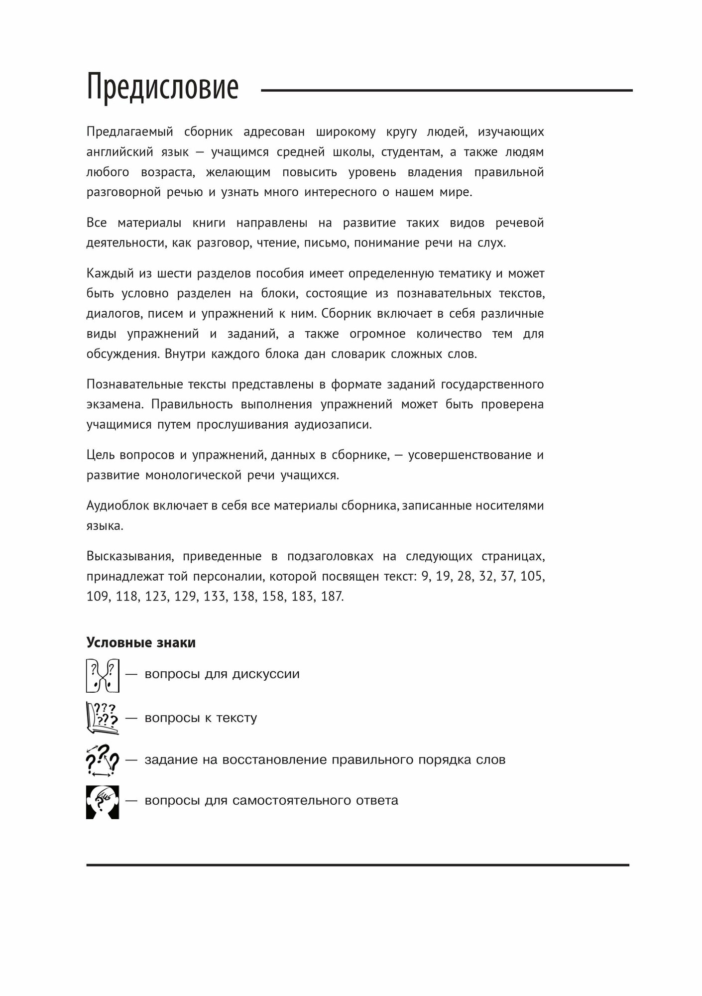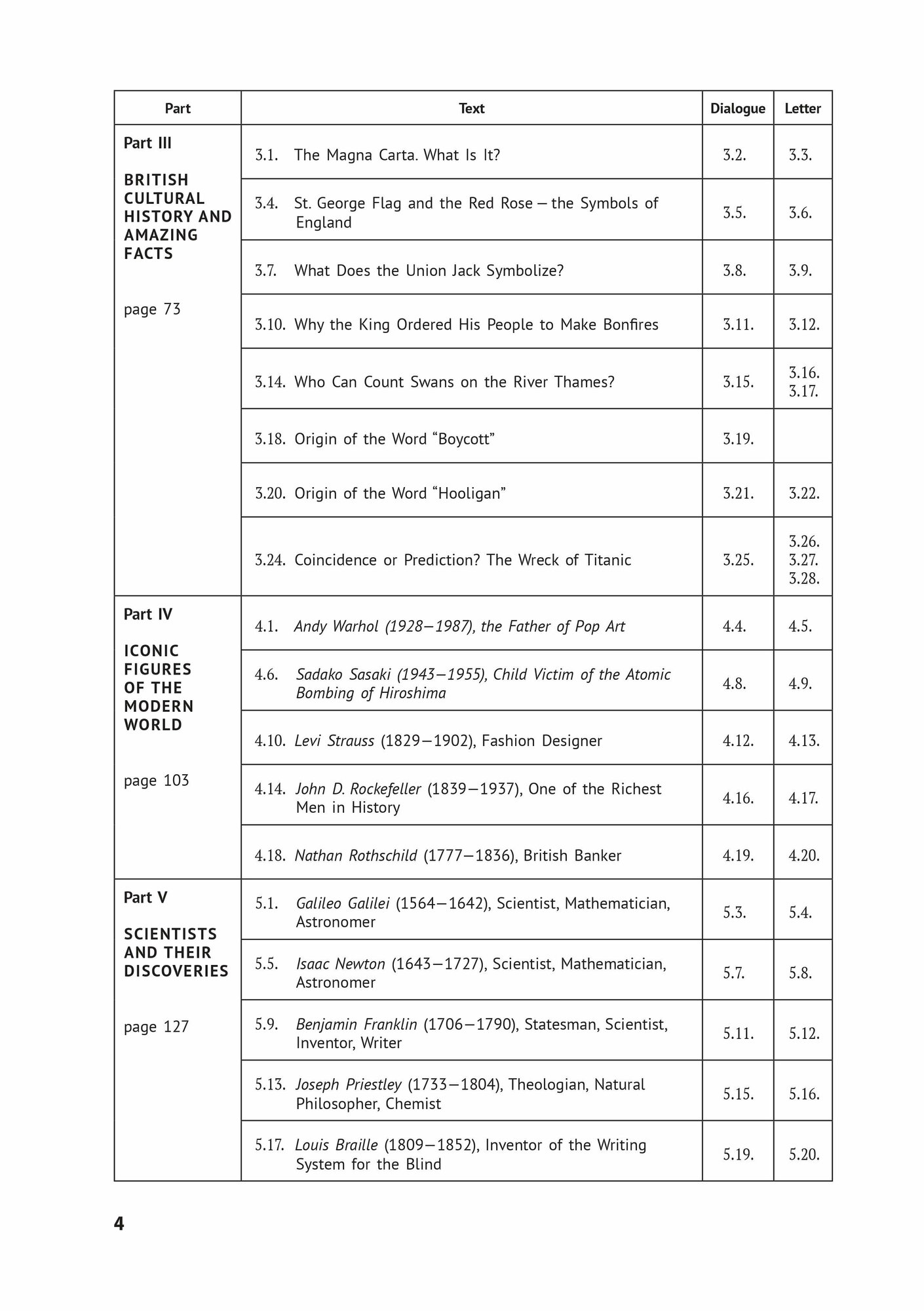 В книге собраны тексты с интересной тематикой: например, о знаменитых военачальниках, исследователях, предпринимателях, о людях, оставивших след во всемирной истории; о британских традициях и т. д. Безусловно, чтение текстов расширит кругозор читателя, увеличит объем его активного словаря, укрепит навыки владения грамматикой. В процессе выполнения предложенных к текстам упражнений и прослушивания аудиозаписи учащийся будет тренировать навыки устной речи (в монологе и в диалоге) и навыки восприятия речи на слух.