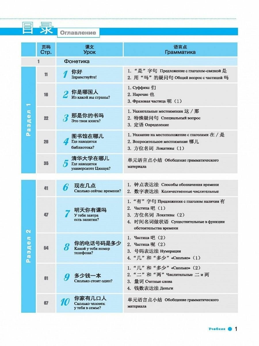 Учебник начинается с фонетического введения - пяти уроков с упражнениями на отработку правильного произношения у учащихся. Основная часть учебника состоит из тридцати уроков. Каждый урок включает в себя новые слова и выражения: на запоминание и написание основных иероглифов, на подстановку слов и на исправление намеренно сделанных ошибок, на самостоятельную композицию фраз. Каждый блок из пяти уроков завершается обобщающим уроком для повторения и контроля изученного.