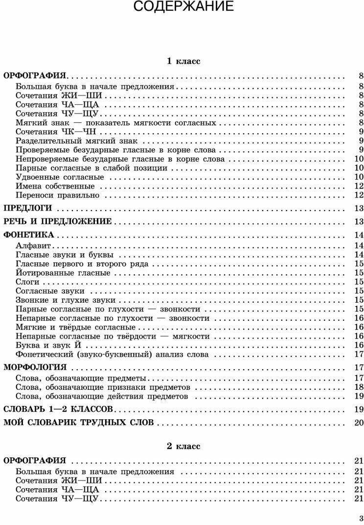 Хороший справочник для начальных классов. Понравилось, что при разбивке слов на слоги есть правило, сколько гласных, столько и слогов, мы не знали его, а узнав, проблема разделения слов на слоги отпала, единственное, что мне не понравилось, это то, что материал в справочнике дан не по школьной программе, т.е. фонетика дана где-то в середине 1го класса, а первокласники это проходят в самом начале, поэтому сначала даже не нашли нужный нам раздел, также могу рекомендовать справочник для начальных классов под редакцией Шкляровой, но там более скупо написано, тут на мой взгляд более адаптировано для ребенка начальных классов.