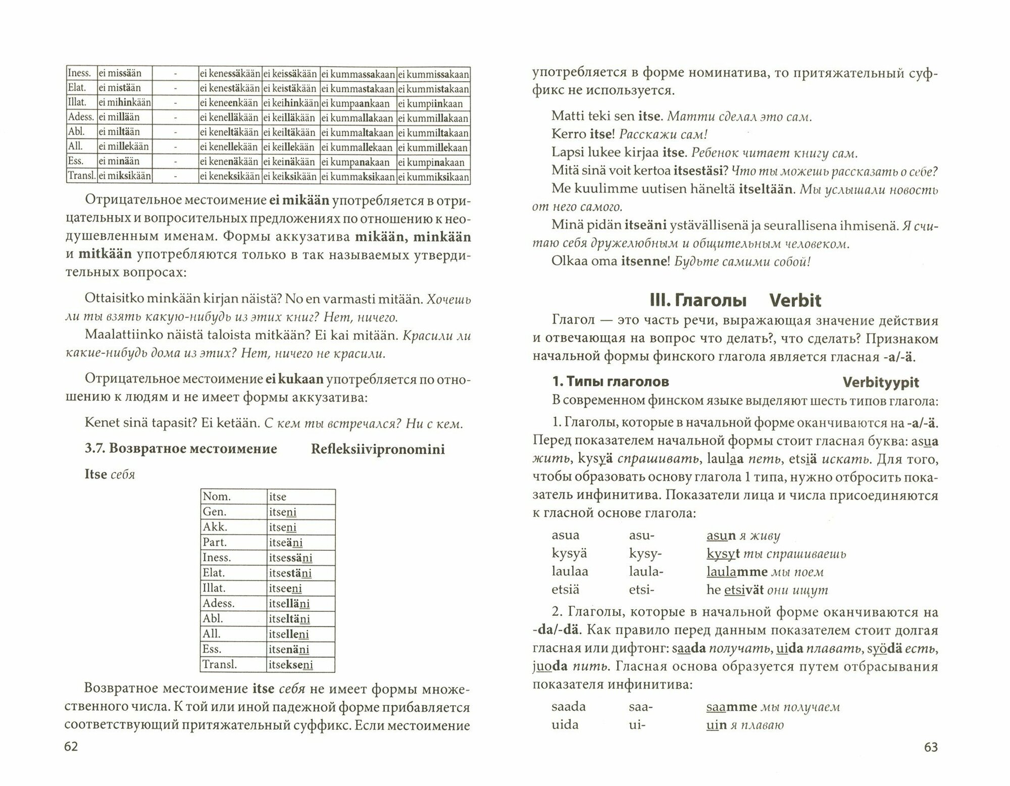 Компактный учебник с правилами грамматики финского языка, размером примерно с тетрадь. В нем 128 страниц, большая часть которых посвещена падежам и формам глагола. Много таблиц, но при этом они не составляют большую часть информации, половину объема занимает текст с объяснением правил и исключений. Есть примеры с переводом на русский. Учебник, конечно, не подойдет как самостоятельный самоучитель, но как дополнение к занятиям, например, с репетитором, чтобы время от времени искать или повторять какое-то правило, думаю, вполне подойдет.