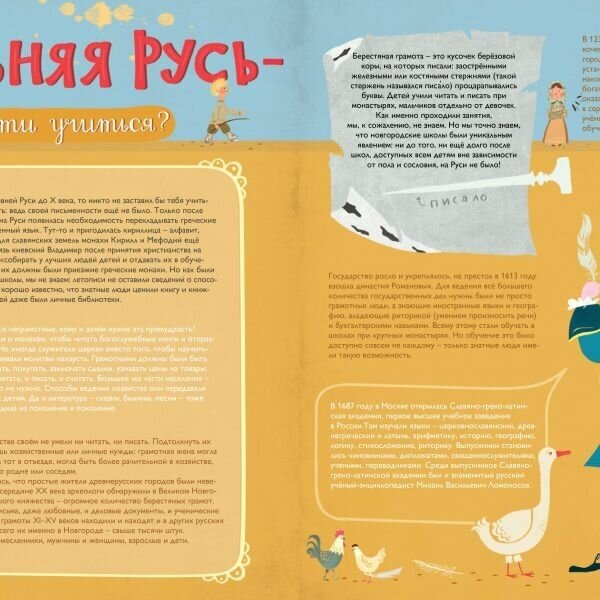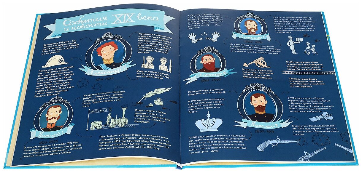 Главное, что текст и картинки в этой книги очень взаимосвязаны, одно без другого не работает. Текст расположен короткими абзацами, и это делает чтение очень легким. И в самом тексте – не сухая историческая информация, не учебник, а веселые детали, простые рассказы по теме. Рисунки забавные, смешные, напоминают хороший мультик. Читать лучше вместе с ребенком, будет интересно пятиклассникам и старше. Еще важно отметить, что эту книгу надо будет обязательно сохранить до выпускных экзаменов и поступления в вуз, особенно если речь про гуманитариев: много полезного по истории и литературе. Почти энциклопедия, но очень легкая. -
