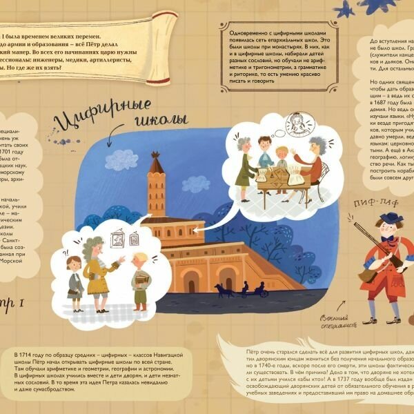 ) ), как питались ученики и многое другое. Что важно, в каждой главе авторы обязательно выстраивают какую-то логичную историческую линию в связи с тем или иным институтом или школой. И ты, читая, видишь логику и как бы ход истории: например, нужны были образованные дворяне – открыли Сухопутный кадетский корпус, а потом эти образованные дворяне, выпускники корпуса, вышли на Сенатскую площадь на декабристское восстание. Отдельная тема – вся советская эпоха, картинки особенно повеселят)
