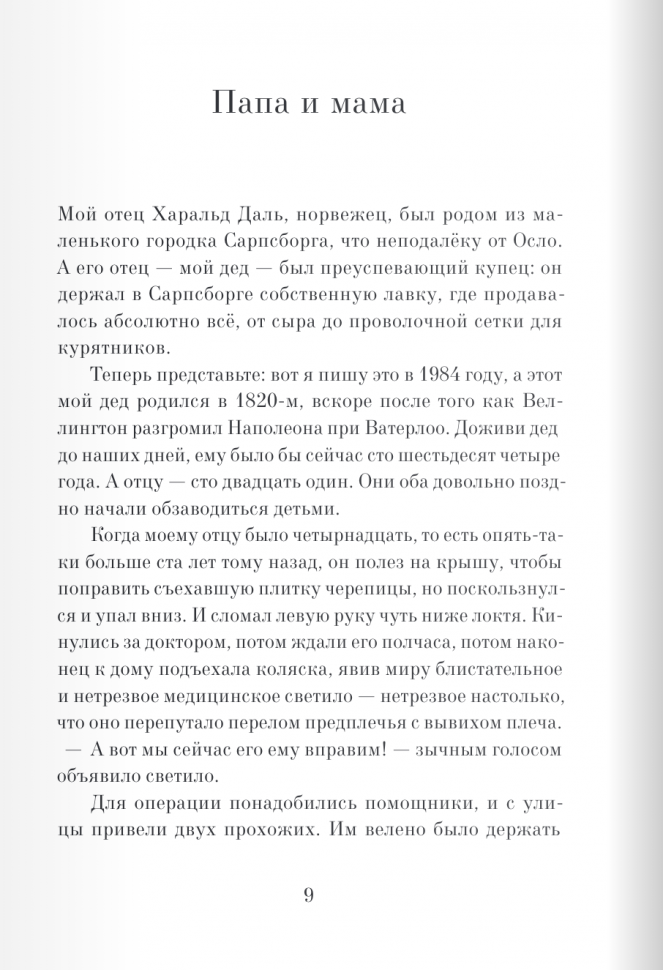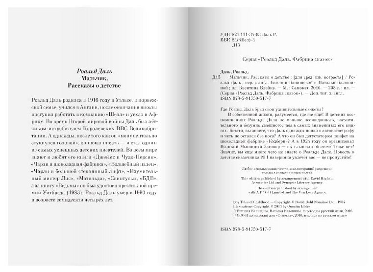 Если вы поклонник творчества (как взрослого, так и детского) Роальда Даля, эта книга для вас. На страницах этой книги можно встретить "знакомых" героев сказок, интересно было узнать как рос писатель, другое время и страна. Не думаю, что маленьким читателям будет интересно слушать саму книгу, но ввернуть историю из жизни писателя, читая очередную сказку будет полезно. Я люблю такие автобиографии состоящие из коротких историй.