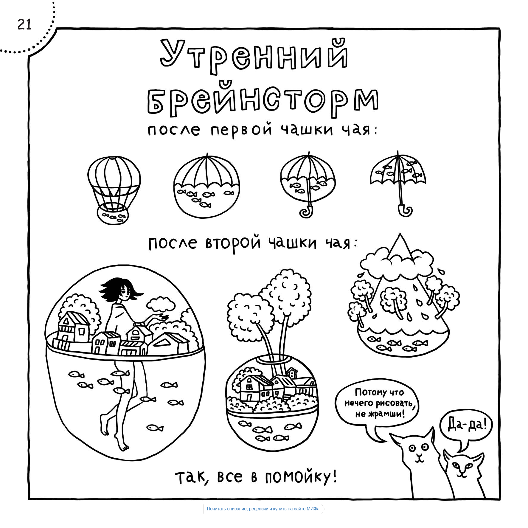 Я фанат книг Яны Франк и не могла пройти мимо этого блокнота. И влюбилась с него с первой страницы. Яна Франк в своем стиле — книга получилась задорная и остроумная. Вы бы смогли, например, изобразить отчаяние, или вдохновение или счастье в паре картинок? И там таких много. Альбом можно раскрашивать, дорисовывать, записывать свои идеи. Кстати, они возникают одна за другой, даже если просто рассматривать страницы этой книги.