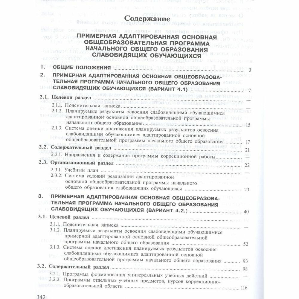 Примерная адаптированная основная общеобразовательная программа начального общего образования слабовидящих обучающихся разработана в соответствии с требованиями ФГОС НОО обучающихся с ограниченными возможностями здоровья, предъявляемыми к структуре, условиям реализации и планируемым результатам освоения АООП (варианты 4.1, 4.2, 4.3). Каждый вариант программы содержит целевой, содержательный и организационный разделы с определением требований, учитывающих особенности психофизического развития и индивидуальные возможности обучающихся и обеспечивающих коррекцию нарушений развития и социальную адаптацию. Программа одобрена решением федерального учебно-методического объединения по общему образованию (протокол от 22 декабря 2015 г. № 4/15).