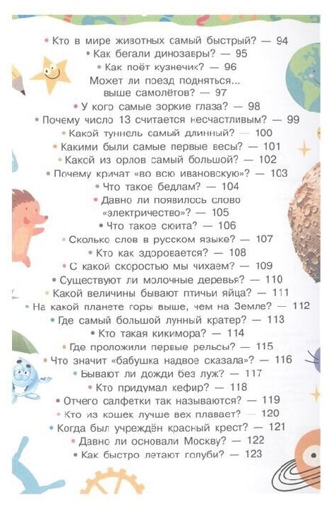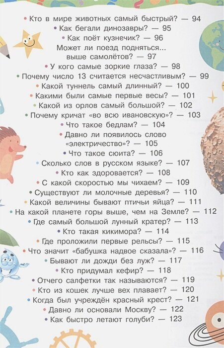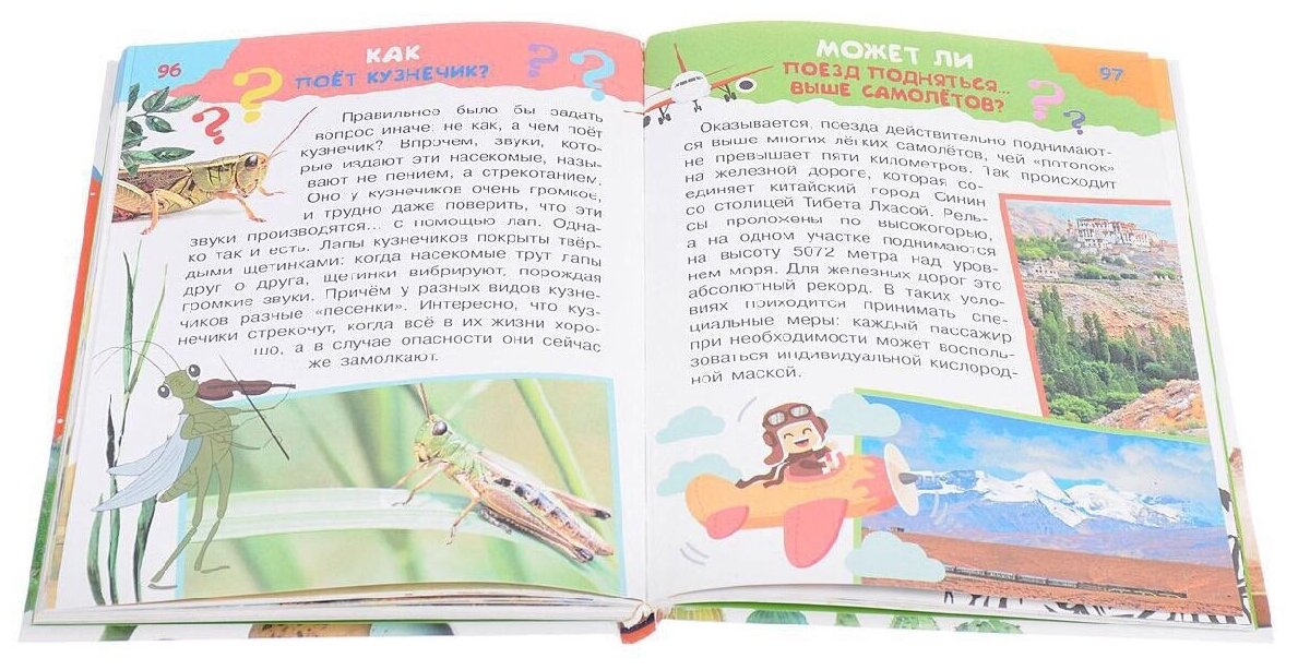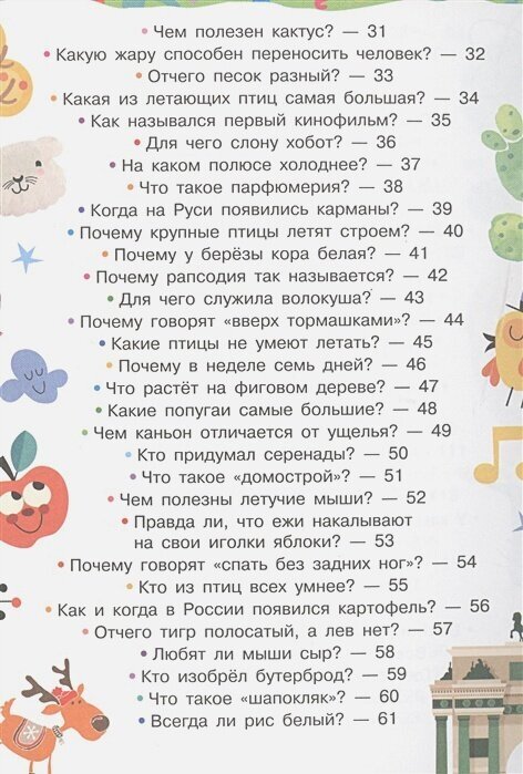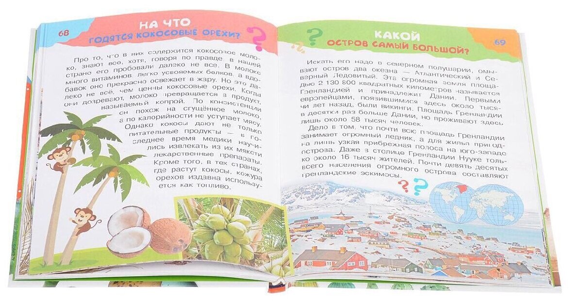Покупая книги в интернет-магазинах, часто сталкиваюсь с проблемой, что нельзя книгу полистать и понять, что у ней внутри, особенно сильно это мешает при покупке энциклопедий, ведь в художественной литературе, текст будет один и тот же в независимости от дизайна книги, с энциклопедиями все совсем иначе. Поэтому хочу кратко рассказать, что представляет из себя именно эта книга. Каждая страница книги посвящена ответу на вопрос, который сформулирован в верху страницы. Ответы сопровождаются фотографиями и картинками. Одной конкретной тематики у вопросов нет, это просто набор фактов из абсолютно разных областей. Так, например, почему в неделе семь дней,на что годятся кокосовые орехи или как назывался первый кинофильм? Ответы на эти и многие другие вопросы можно найти в этой небольшой энциклопедии.