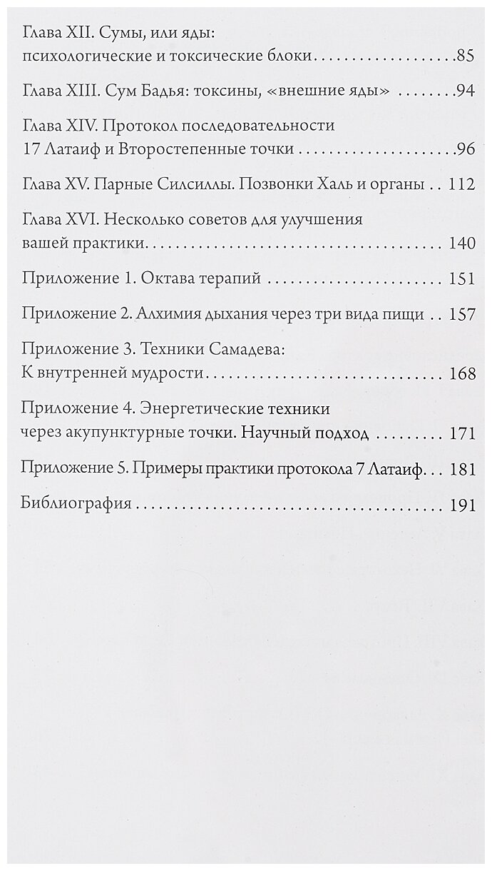 В книге изложена оригинальная концепция исцеления, основанная на биоэнергетическом подходе. Рассматриваются такие вопросы, как Эннеаграмма здоровья, История, философия и теория данной системы, Основной принцип, Определение Макама, Процедуры восстановления гармонии, Некоторые точки и их взаимосвязь с центрами, Тимус, Протокол последовательности Семи Латаиф, Оценивание, Заякорение ОЭ Октава Эннеаграммы и ЗН земля-небо, Удивительный феномен вершины, Сумы, или яды: психологические и токсические блоки, Сум Бадья: токсины, внешние яды, Протокол последовательности, Латаиф и Второстепенные точки, Парные Силсиллы. Позвонки Халь и органы, Несколько советов для улучшения вашей практики. В Приложениях представлены Октава терапий, Алхимия дыхания через три вида пищи, Техники Самадева: К внутренней мудрости, Энергетические техники через акупунктурные точки. Научный подход, даны Примеры практики протокола 7 Латаиф. Для читателей, практикующих биоэнергетический подход для достижения здоровья и долголетия.