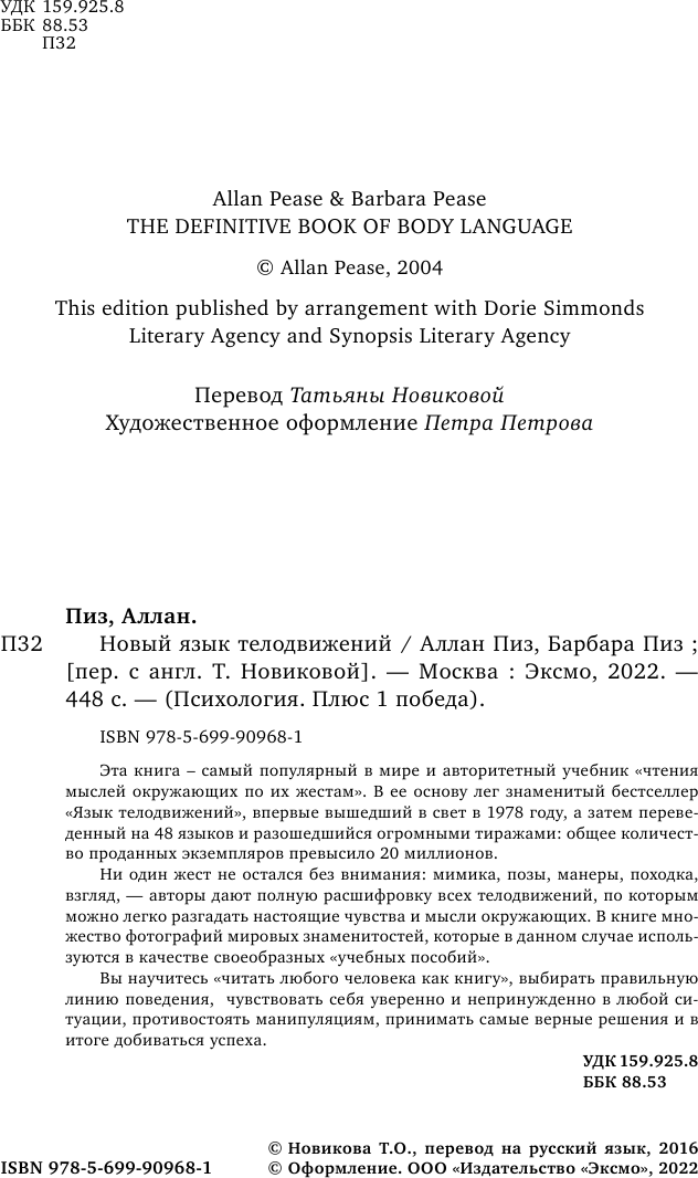 Хочу подчеркнуть, что "Язык телодвижений" не просто лёг в основу данного издания, а полностью и в точности переписан теми же словами и с использованием тех же иллюстраций. Отличие только в обложке и улучшенном качеством бумаги. Если у Вас есть первая книга, то эту можно купить лишь в подарок кому-то. Я купила себе обе, понадеявшись на то, что прошло несколько десятков лет после первого исследования, ожидала увидеть что-то новое, но ожидания не подтвердились. Вся информация полностью дублируется. Но в целом, если покупать что-то одно: либо "язык...", либо "новый язык...", Вы получите очень много новых ценных и полезных знаний, а также возможность потренировать себя в этом.