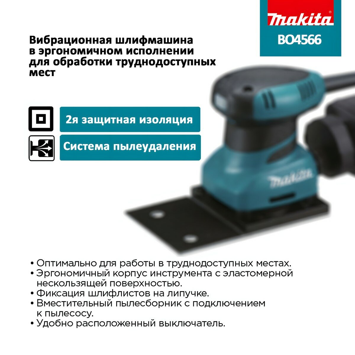 Вибрационная шлифовальная машина Makita BO 4566 принадлежит к новому поколению инструментов, характеризующимися высокой производительностью и обеспечивающими превосходное качество работ при максимальном комфорте пользователя. Вибрационная шлифовальная машина Макита ВО 4566 оснащена эффективным двигателем (200 Вт), приводящим в движение рабочую платформу: за одну минуту платформа совершает 14000 возвратно-поступательных движений с амплитудой 1.5 мм.