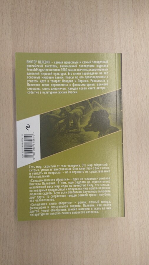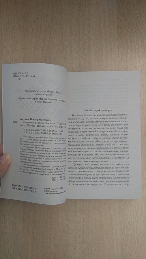 С удивлением обнаружил, что раньше не читал СВЯЩЕННУЮ КНИГУ ОБОРОТНЯ (думая, что это тождественно раннему рассказу ПРОБЛЕМЫ ВЕРВОЛЬФА В СРЕДНЕЙ ПОЛОСЕ). Прочитал с большим кайфом! Реалии, которые Пелевин предсказал/увидел/высмеял в 2006-м, в 2016-м никуда не делись. А некоторые вещи стали ещё более актуальными. Короче, здорово!