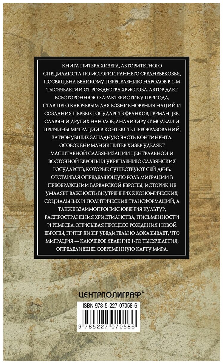 Книга Питера Хизера, авторитетного специалиста по истории раннего Средневековья, посвящена великому переселению народов в 1м тысячелетии от Рождества Христова. Автор дает всестороннюю характеристику периода, ставшего ключевым для возникновения наций и создания первых государств франков, германцев, славян и других народов; анализирует модели и причины миграции в контексте преобразований, затронувших западную часть континента. Особое внимание Питер Хизер уделяет масштабной славянизации Центральной и Восточной Европы и укреплению славянских государств, которые существуют по сей день. Отстаивая определяющую роль миграции в преображении варварской Европы, историк не умаляет важности внутренних экономических, социальных и политических трансформаций, а также взаимопроникновения культур, распространения христианства, письменности и ремесел. Описывая процесс рождения новой Европы, Питер Хизер убедительно доказывает, что миграция - ключевое явление 1го тысячелетия, определившее современную карту мира.