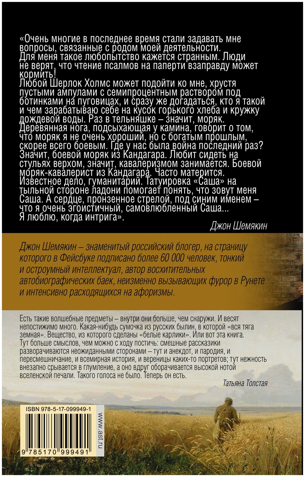 Для всех поклонников творчества Джона Шемякина и любителей неординарного юмора - обязательно к прочтению! Получила наслаждение от каждого слова. Муж мой до этого не знал творчества автора, но тоже втянулся, читал и смеялся в голос, хотя вообще мужчина суровый, сам себе не улыбается. Юмор очень своеобразный, но если уж зашел, то будет не остановить - захочется прочитать все, включая все посты на ФБ